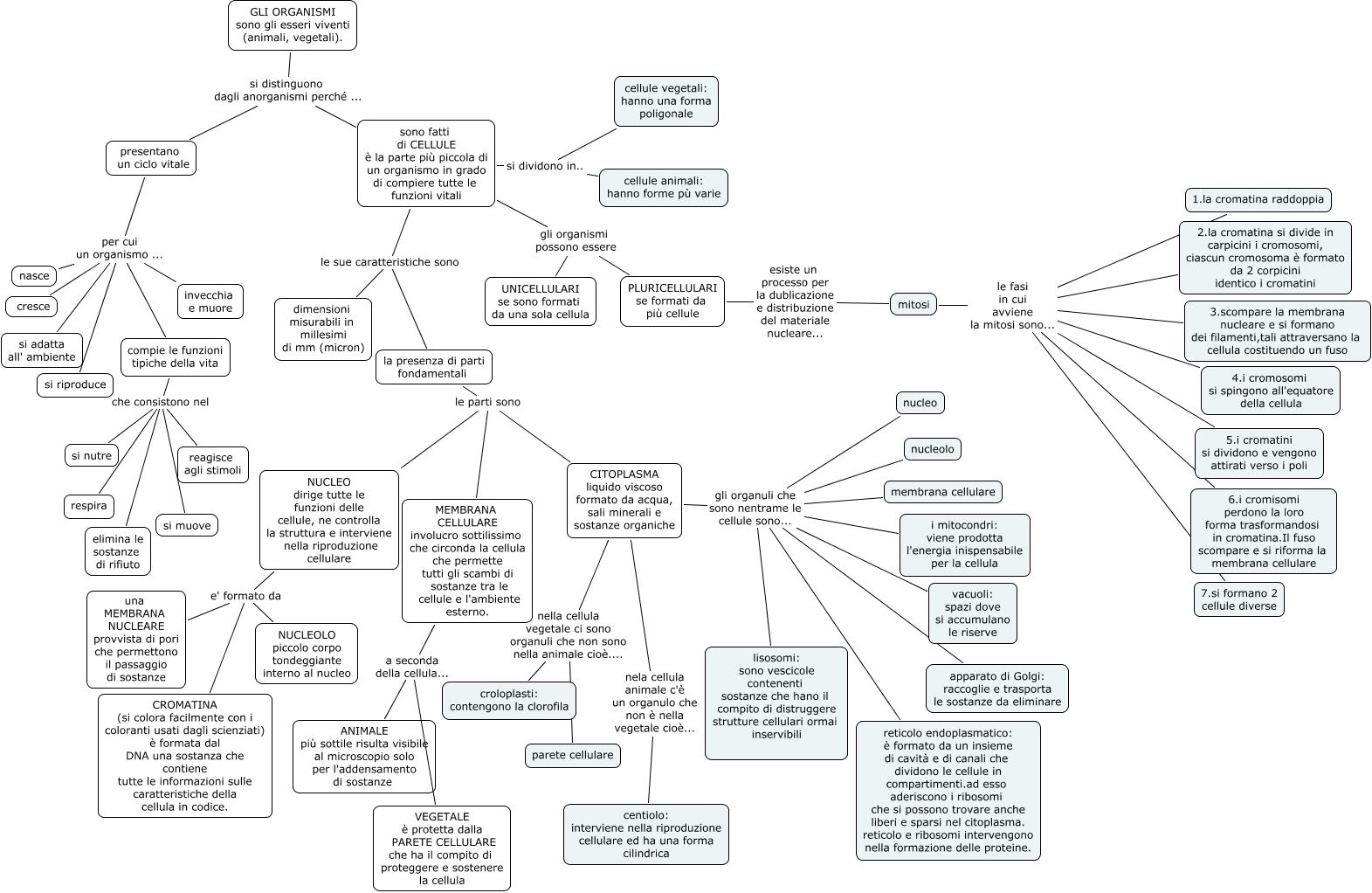 Questa Cmap, creata con IHMC CmapTools, contiene informazioni relative a: esseri viventi virgy pag. 166-167-168-169, CITOPLASMA liquido viscoso formato da acqua, sali minerali e sostanze organiche nella cellula vegetale ci sono organuli che non sono nella animale cioè.... croloplasti: contengono la clorofila, GLI ORGANISMI sono gli esseri viventi (animali, vegetali). si distinguono dagli anorganismi perché ... sono fatti di CELLULE è la parte più piccola di un organismo in grado di compiere tutte le funzioni vitali, GLI ORGANISMI sono gli esseri viventi (animali, vegetali). si distinguono dagli anorganismi perché ... presentano un ciclo vitale, compie le funzioni tipiche della vita che consistono nel reagisce agli stimoli, NUCLEO dirige tutte le funzioni delle cellule, ne controlla la struttura e interviene nella riproduzione cellulare e' formato da una MEMBRANA NUCLEARE provvista di pori che permettono il passaggio di sostanze, mitosi le fasi in cui avviene la mitosi sono... 2.la cromatina si divide in carpicini i cromosomi, ciascun cromosoma è formato da 2 corpicini identico i cromatini, CITOPLASMA liquido viscoso formato da acqua, sali minerali e sostanze organiche gli organuli che sono nentrame le cellule sono... lisosomi: sono vescicole contenenti sostanze che hano il compito di distruggere strutture cellulari ormai inservibili, CITOPLASMA liquido viscoso formato da acqua, sali minerali e sostanze organiche gli organuli che sono nentrame le cellule sono... apparato di Golgi: raccoglie e trasporta le sostanze da eliminare, MEMBRANA CELLULARE involucro sottilissimo che circonda la cellula che permette tutti gli scambi di sostanze tra le cellule e l'ambiente esterno. a seconda della cellula... ANIMALE più sottile risulta visibile al microscopio solo per l'addensamento di sostanze, mitosi le fasi in cui avviene la mitosi sono... 4.i cromosomi si spingono all'equatore della cellula, NUCLEO dirige tutte le funzioni delle cellule, ne controlla la struttura e interviene nella riproduzione cellulare e' formato da CROMATINA (si colora facilmente con i coloranti usati dagli scienziati) è formata dal DNA una sostanza che contiene tutte le informazioni sulle caratteristiche della cellula in codice., MEMBRANA CELLULARE involucro sottilissimo che circonda la cellula che permette tutti gli scambi di sostanze tra le cellule e l'ambiente esterno. a seconda della cellula... VEGETALE è protetta dalla PARETE CELLULARE che ha il compito di proteggere e sostenere la cellula, mitosi le fasi in cui avviene la mitosi sono... 5.i cromatini si dividono e vengono attirati verso i poli, compie le funzioni tipiche della vita che consistono nel respira, mitosi le fasi in cui avviene la mitosi sono... 7.si formano 2 cellule diverse, sono fatti di CELLULE è la parte più piccola di un organismo in grado di compiere tutte le funzioni vitali si dividono in.. cellule vegetali: hanno una forma poligonale, sono fatti di CELLULE è la parte più piccola di un organismo in grado di compiere tutte le funzioni vitali gli organismi possono essere UNICELLULARI se sono formati da una sola cellula, sono fatti di CELLULE è la parte più piccola di un organismo in grado di compiere tutte le funzioni vitali si dividono in.. cellule animali: hanno forme pù varie, compie le funzioni tipiche della vita che consistono nel si muove, NUCLEO dirige tutte le funzioni delle cellule, ne controlla la struttura e interviene nella riproduzione cellulare e' formato da NUCLEOLO piccolo corpo tondeggiante interno al nucleo