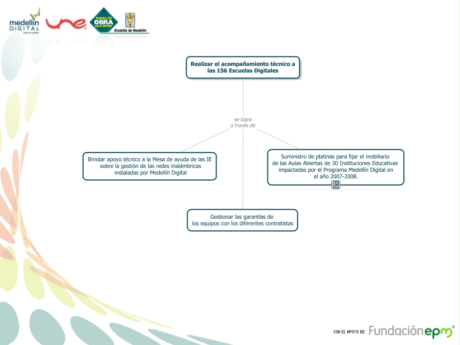 Este Cmap, tiene información relacionada con: Educación-Entregables 1, Realizar el acompañamiento técnico a las 156 Escuelas Digitales se logra a través de Brindar apoyo técnico a la Mesa de ayuda de las IE sobre la gestión de las redes inalámbricas instaladas por Medellín Digital, Realizar el acompañamiento técnico a las 156 Escuelas Digitales se logra a través de Gestionar las garantías de los equipos con los diferentes contratistas, Realizar el acompañamiento técnico a las 156 Escuelas Digitales se logra a través de Suministro de platinas para fijar el mobiliario de las Aulas Abiertas de 30 Instituciones Educativas impactadas por el Programa Medellín Digital en el año 2007-2008.