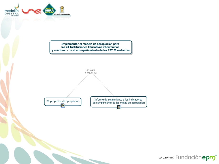 Este Cmap, tiene información relacionada con: Educación-Entregables 4, Implementar el modelo de apropiación para las 24 Instituciones Educativas intervenidas y continuar con el acompañamiento de las 132 IE restantes se logra a través de 24 proyectos de apropiación, Implementar el modelo de apropiación para las 24 Instituciones Educativas intervenidas y continuar con el acompañamiento de las 132 IE restantes se logra a través de Informe de seguimiento a los indicadores de cumplimiento de las metas de apropiación