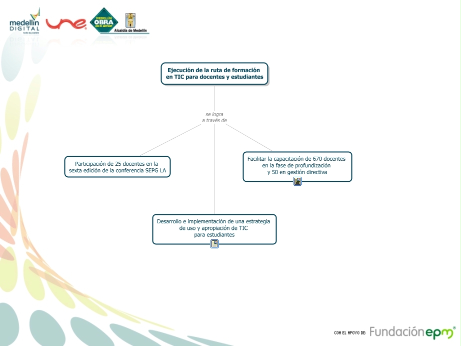 Este Cmap, tiene información relacionada con: Educación-Entregables 5, Ejecución de la ruta de formación en TIC para docentes y estudiantes se logra a través de Participación de 25 docentes en la sexta edición de la conferencia SEPG LA, Ejecución de la ruta de formación en TIC para docentes y estudiantes se logra a través de Facilitar la capacitación de 670 docentes en la fase de profundización y 50 en gestión directiva, Ejecución de la ruta de formación en TIC para docentes y estudiantes se logra a través de Desarrollo e implementación de una estrategia de uso y apropiación de TIC para estudiantes