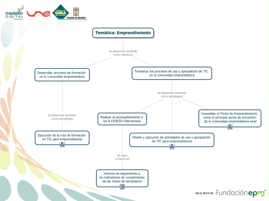 Este Cmap, tiene información relacionada con: Tematica Emprendimiento, Fortalecer los procesos de uso y apropiación de TIC en la comunidad emprendedora se desarrolla teniendo como estrategias Consolidar el Portal de Emprendimiento como el principal punto de encuentro de la comunidad emprendedora local, Desarrollar procesos de formación en la comunidad emprendedora se desarrolla teniendo como estrategias Ejecución de la ruta de formación en TIC para emprendedores, Temática: Emprendimiento se desarrolla teniendo como objetivos Fortalecer los procesos de uso y apropiación de TIC en la comunidad emprendedora, Realizar el acompañamiento a los 8 CEDEZO intervenidos se logra a través de Informe de seguimiento a los indicadores de cumplimiento de las metas de apropiación, Fortalecer los procesos de uso y apropiación de TIC en la comunidad emprendedora se desarrolla teniendo como estrategias Diseño y ejecución de actividades de uso y apropiación de TIC para emprendedores, Temática: Emprendimiento se desarrolla teniendo como objetivos Desarrollar procesos de formación en la comunidad emprendedora, Fortalecer los procesos de uso y apropiación de TIC en la comunidad emprendedora se desarrolla teniendo como estrategias Realizar el acompañamiento a los 8 CEDEZO intervenidos