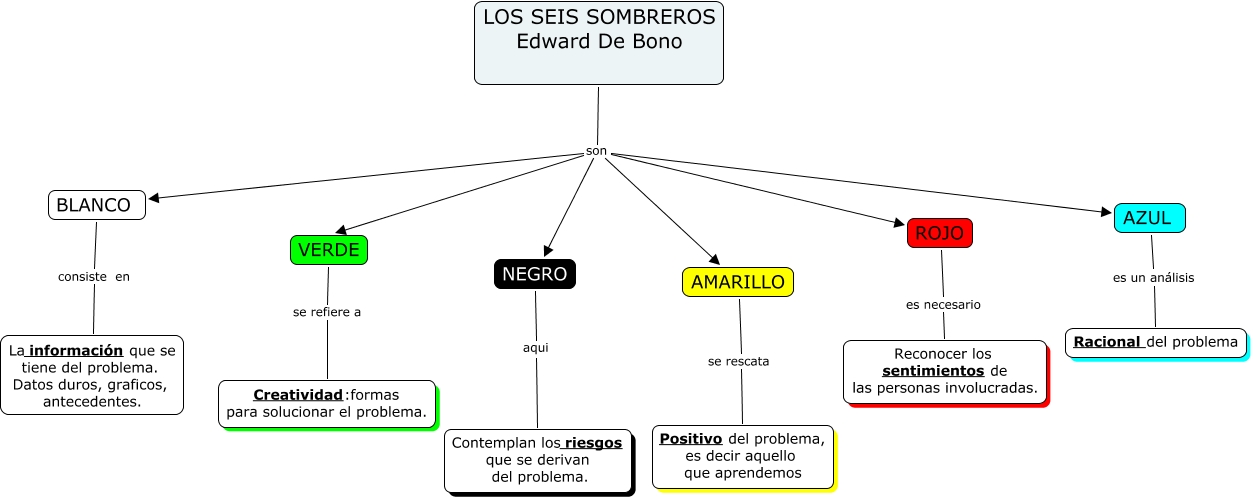 Este Cmap, tiene información relacionada con: los 6 sombreros, AZUL es un análisis Racional del problema, LOS SEIS SOMBREROS Edward De Bono son BLANCO, LOS SEIS SOMBREROS Edward De Bono son ROJO, LOS SEIS SOMBREROS Edward De Bono son NEGRO, LOS SEIS SOMBREROS Edward De Bono son AMARILLO, BLANCO consiste en La información que se tiene del problema. Datos duros, graficos, antecedentes., VERDE se refiere a Creatividad:formas para solucionar el problema., ROJO es necesario Reconocer los sentimientos de las personas involucradas., LOS SEIS SOMBREROS Edward De Bono son VERDE, NEGRO aqui Contemplan los riesgos que se derivan del problema., AMARILLO se rescata Positivo del problema, es decir aquello que aprendemos, LOS SEIS SOMBREROS Edward De Bono son AZUL