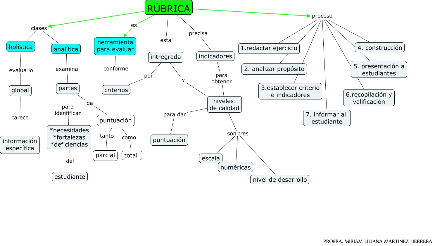 Este Cmap, tiene información relacionada con: RUBRICA, RÚBRICA clases holística, holística evalua lo global, niveles de calidad son tres numéricas, RÚBRICA proceso 5. presentación a estudiantes, RÚBRICA proceso 1.redactar ejercicio, partes da puntuación, niveles de calidad son tres nivel de desarrollo, RÚBRICA proceso 4. construcción, RÚBRICA clases analítica, RÚBRICA proceso 2. analizar propósito, intregrada y niveles de calidad, analítica examina partes, RÚBRICA proceso 7. informar al estudiante, herramienta para evaluar conforme criterios, indicadores para obtener niveles de calidad, intregrada por criterios, RÚBRICA es herramienta para evaluar, RÚBRICA esta intregrada, *necesidades *fortalezas *deficiencias del estudiante, global carece información específica
