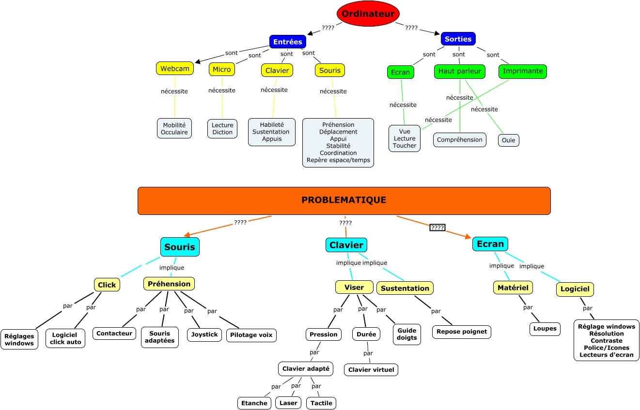 Cette carte de concepts créée avec IHMC CmapTools traite de: Problématiques, Logiciel par Réglage windows Résolution Contraste Police/Icones Lecteurs d'ecran, Haut parleur nécessite Ouïe, Ordinateur ???? Sorties, Pression par Clavier adapté, Préhension par Souris adaptées, Clavier nécessite Habileté Sustentation Appuis, Entrées sont Micro, Préhension par Contacteur, Durée par Clavier virtuel, Clavier adapté par Etanche, Sorties sont Haut parleur, Micro nécessite Lecture Diction, Click par Logiciel click auto, Clavier implique Viser, Clavier implique Sustentation, Ecran implique Matériel, Ecran nécessite Vue Lecture Toucher, Souris implique Préhension, Souris nécessite Préhension Déplacement Appui Stabilité Coordination Repère espace/temps, Viser par Durée