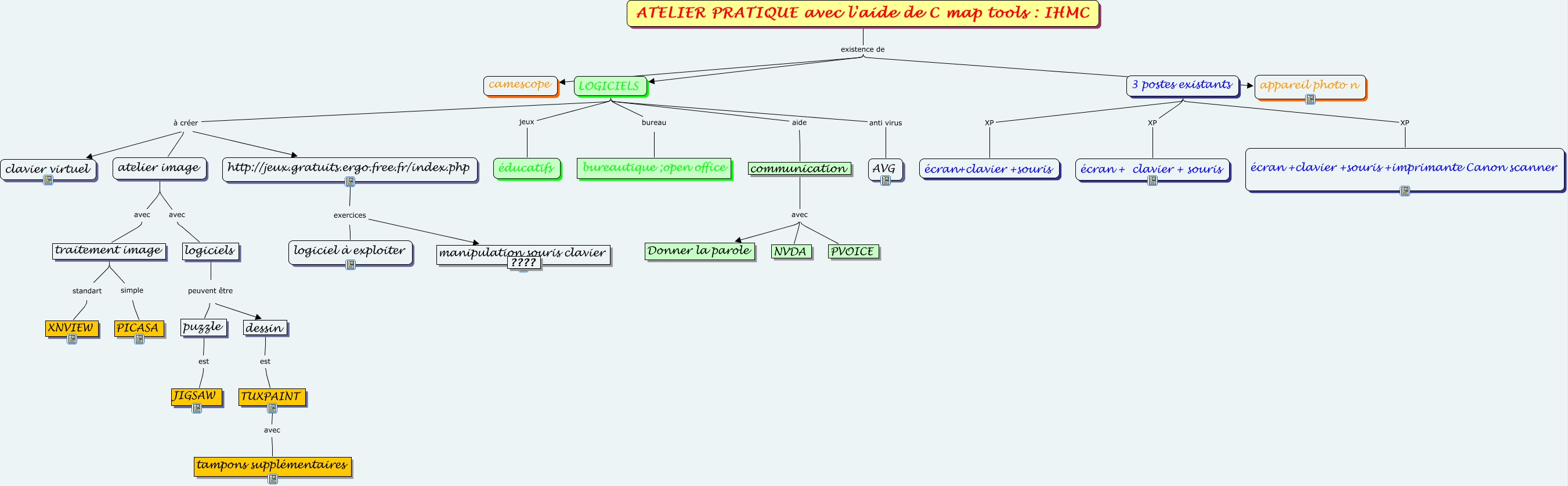 Cette carte de concepts créée avec IHMC CmapTools traite de: Sans titre 1, puzzle est JIGSAW, LOGICIELS à créer http://jeux.gratuits.ergo.free.fr/index.php, 3 postes existants XP écran+clavier +souris, TUXPAINT avec tampons supplémentaires, logiciels peuvent être puzzle, communication avec Donner la parole, traitement image simple PICASA, atelier image avec logiciels, ATELIER PRATIQUE avec l'aide de C map tools : IHMC existence de LOGICIELS, LOGICIELS aide communication, logiciels peuvent être dessin, ATELIER PRATIQUE avec l'aide de C map tools : IHMC existence de appareil photo n, ATELIER PRATIQUE avec l'aide de C map tools : IHMC existence de camescope, manipulation souris clavier ???? ????, traitement image standart XNVIEW, LOGICIELS anti virus AVG, communication avec NVDA, communication avec PVOICE, LOGICIELS bureau bureautique ;open office, LOGICIELS jeux éducatifs