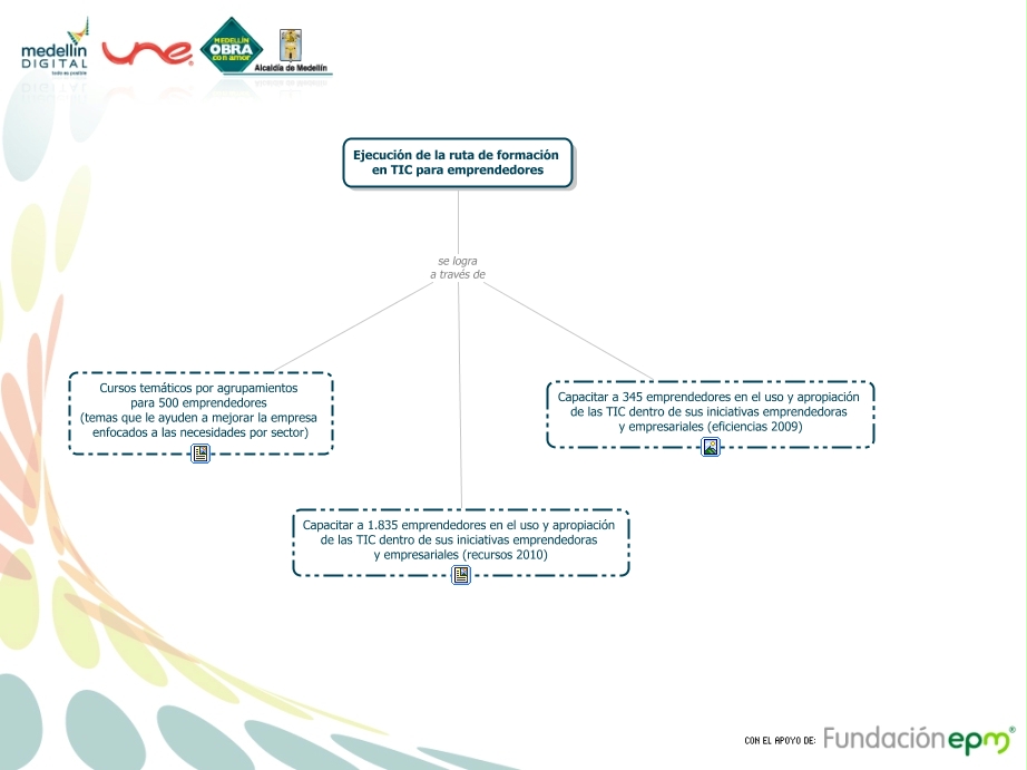 Este Cmap, tiene información relacionada con: Emprendimiento-Entregables 1, Ejecución de la ruta de formación en TIC para emprendedores se logra a través de Capacitar a 345 emprendedores en el uso y apropiación de las TIC dentro de sus iniciativas emprendedoras y empresariales (eficiencias 2009), Ejecución de la ruta de formación en TIC para emprendedores se logra a través de Cursos temáticos por agrupamientos para 500 emprendedores (temas que le ayuden a mejorar la empresa enfocados a las necesidades por sector), Ejecución de la ruta de formación en TIC para emprendedores se logra a través de Capacitar a 1.835 emprendedores en el uso y apropiación de las TIC dentro de sus iniciativas emprendedoras y empresariales (recursos 2010)