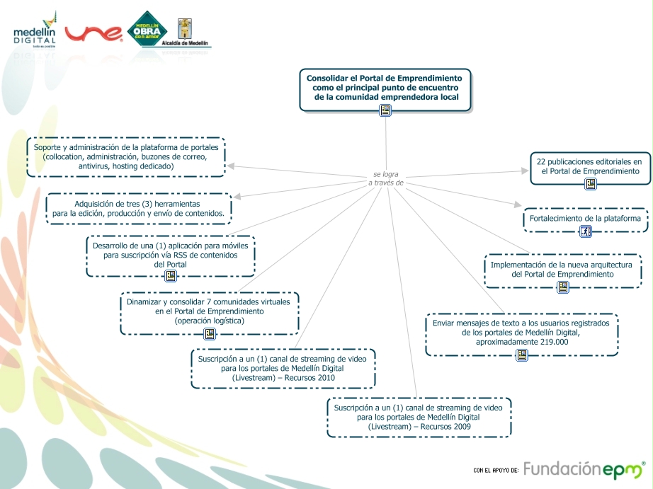 Este Cmap, tiene información relacionada con: Emprendimiento-Entregables 3, Consolidar el Portal de Emprendimiento como el principal punto de encuentro de la comunidad emprendedora local se logra a través de Fortalecimiento de la plataforma, Consolidar el Portal de Emprendimiento como el principal punto de encuentro de la comunidad emprendedora local se logra a través de 22 publicaciones editoriales en el Portal de Emprendimiento, Consolidar el Portal de Emprendimiento como el principal punto de encuentro de la comunidad emprendedora local se logra a través de Dinamizar y consolidar 7 comunidades virtuales en el Portal de Emprendimiento (operación logística), Consolidar el Portal de Emprendimiento como el principal punto de encuentro de la comunidad emprendedora local se logra a través de Suscripción a un (1) canal de streaming de video para los portales de Medellín Digital (Livestream) – Recursos 2009, Consolidar el Portal de Emprendimiento como el principal punto de encuentro de la comunidad emprendedora local se logra a través de Adquisición de tres (3) herramientas para la edición, producción y envío de contenidos., Consolidar el Portal de Emprendimiento como el principal punto de encuentro de la comunidad emprendedora local se logra a través de Soporte y administración de la plataforma de portales (collocation, administración, buzones de correo, antivirus, hosting dedicado), Consolidar el Portal de Emprendimiento como el principal punto de encuentro de la comunidad emprendedora local se logra a través de Implementación de la nueva arquitectura del Portal de Emprendimiento, Consolidar el Portal de Emprendimiento como el principal punto de encuentro de la comunidad emprendedora local se logra a través de Desarrollo de una (1) aplicación para móviles para suscripción vía RSS de contenidos del Portal, Consolidar el Portal de Emprendimiento como el principal punto de encuentro de la comunidad emprendedora local se logra a través de Enviar mensajes de texto a los usuarios registrados de los portales de Medellín Digital, aproximadamente 219.000, Consolidar el Portal de Emprendimiento como el principal punto de encuentro de la comunidad emprendedora local se logra a través de Suscripción a un (1) canal de streaming de video para los portales de Medellín Digital (Livestream) – Recursos 2010