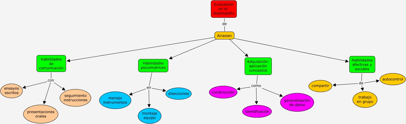 Este Cmap, tiene información relacionada con: Evaluación de desempeño, Airasian ???? Habilidades de comunicación, Airasian ???? Adquisición- aplicación conceptos, Habilidades de comunicación con ensayos escritos, Airasian ???? Habilidades afectivas y sociales, Airasian ???? Habilidades psicomotrices, Habilidades de comunicación con presentaciones orales, Adquisición- aplicación conceptos como generalización de datos, Habilidades afectivas y sociales de autocontrol, Habilidades psicomotrices en montaje equipo, Habilidades psicomotrices en manejo instrumentos, Habilidades psicomotrices en disecciones, Habilidades de comunicación con seguimiento instrucciones, Evaluación en el desempeño de Airasian, Adquisición- aplicación conceptos como construcción, Habilidades afectivas y sociales de trabajo en grupo, Adquisición- aplicación conceptos como identificación, Habilidades afectivas y sociales de compartir