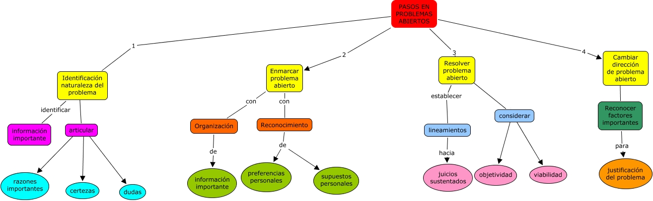 Este Cmap, tiene información relacionada con: Pasos en problemas abiertos, considerar viabilidad, Organización de información importante, Resolver problema abierto establecer lineamientos, lineamientos hacia juicios sustentados, Identificación naturaleza del problema identificar información importante, PASOS EN PROBLEMAS ABIERTOS 1 Identificación naturaleza del problema, articular ???? razones importantes, PASOS EN PROBLEMAS ABIERTOS 3 Resolver problema abierto, Enmarcar problema abierto con Organización, Enmarcar problema abierto con Reconocimiento, considerar ???? objetividad, Identificación naturaleza del problema ???? articular, articular ???? certezas, Reconocer factores importantes para justificación del problema, PASOS EN PROBLEMAS ABIERTOS 4 Cambiar dirección de problema abierto, Reconocimiento de supuestos personales, PASOS EN PROBLEMAS ABIERTOS 2 Enmarcar problema abierto, articular dudas, Resolver problema abierto ???? considerar, Reconocimiento de preferencias personales