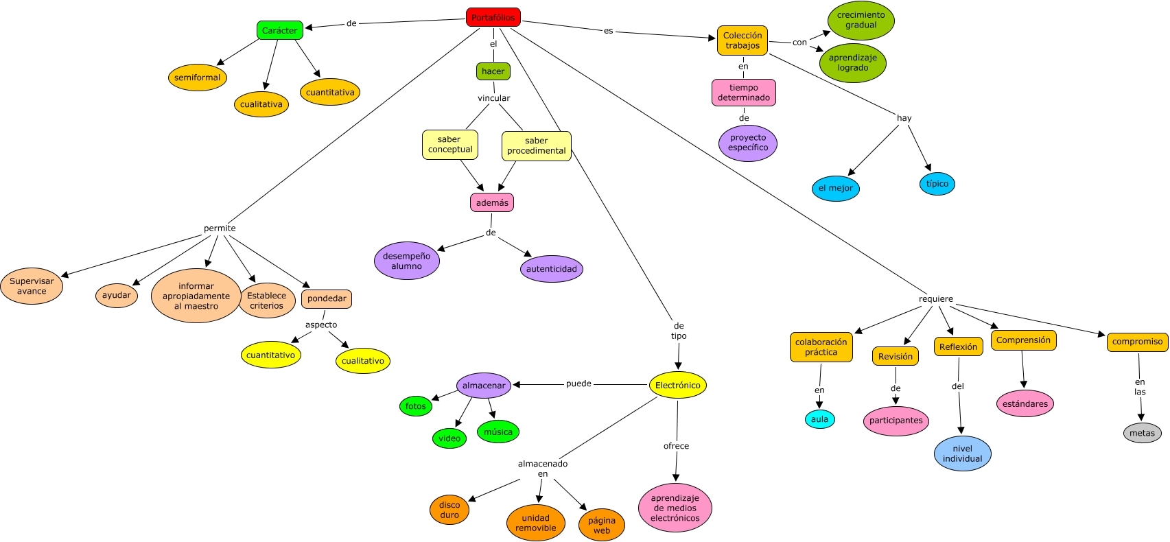Este Cmap, tiene información relacionada con: Portafólios, Portafólios requiere Reflexión, Carácter ???? cualitativa, además de desempeño alumno, Portafólios es Colección trabajos, Colección trabajos con aprendizaje logrado, colaboración práctica en aula, Portafólios permite pondedar, almacenar ???? música, Carácter ???? semiformal, Carácter ???? cuantitativa, compromiso en las metas, Portafólios permite ayudar, Portafólios permite Supervisar avance, Reflexión del nivel individual, almacenar ???? video, Electrónico almacenado en unidad removible, Portafólios el hacer, saber conceptual ???? además, Portafólios requiere colaboración práctica, Portafólios de tipo Electrónico