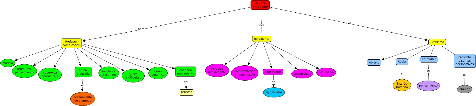 Este Cmap, tiene información relacionada con: Roles en el ABP, Profesor como coach ???? contínuo movimiento, Profesor como coach ???? pruba y desafia, Apela el interés humano, Profesor como coach ???? supervisa aprendizaje, Profesor como coach ???? modela, estudiante ???? participa activamente, presenta distintas perspectivas al alumno, ROLES EN EL ABP para Profesor como coach, constructor de significados, Profesor como coach ???? involucra al alumno, pruba y desafia el pensamiento de alumnos, estudiante ???? comprometido y responsable, Profesor como coach ???? promueve pensamiento, estudiante ???? constructor, Problema ???? promueve, Problema ???? Abierto, contínuo movimiento del proceso, Problema ???? presenta distintas perspectivas, Problema ???? Apela, ROLES EN EL ABP del Problema