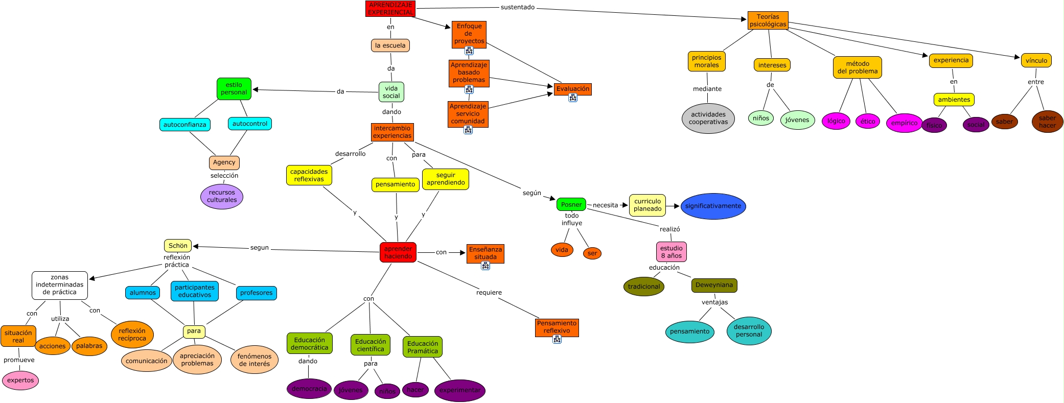 Este Cmap, tiene información relacionada con: 1 El Aprendizaje Experiencial, APRENDIZAJE EXPERIENCIAL en la escuela, Aprendizaje servicio comunidad ???? Evaluación, para ???? comunicación, Posner realizó estudio 8 años, estilo personal ???? autocontrol, método del problema ???? empírico, intercambio experiencias según Posner, vida social dando intercambio experiencias, Posner todo influye ser, Educación democrática dando democracia, vínculo entre saber, intereses de niños, aprender haciendo requiere Pensamiento reflexivo, Enfoque de proyectos ???? Evaluación, aprender haciendo con Educación democrática, Schön reflexión práctica zonas indeterminadas de práctica, método del problema ???? ético, pensamiento y aprender haciendo, curriculo planeado ???? significativamente, participantes educativos para