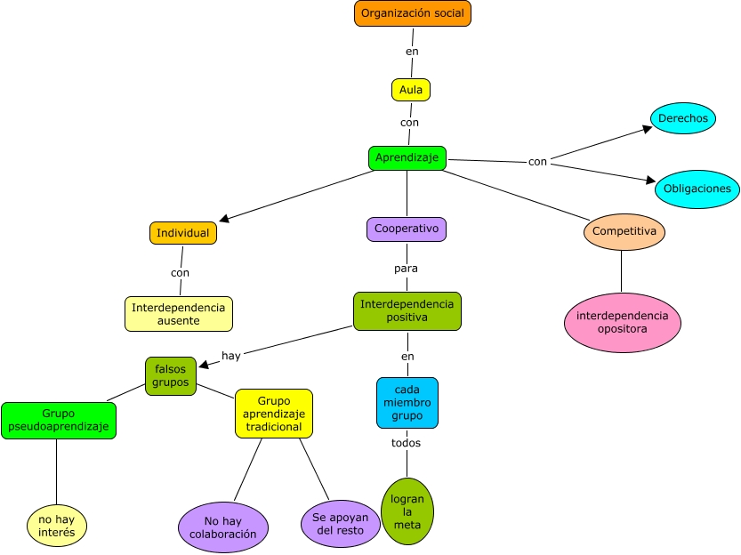 Este Cmap, tiene información relacionada con: Organización social en el aula, Interdependencia positiva en cada miembro grupo, falsos grupos ???? Grupo pseudoaprendizaje, Aula con Aprendizaje, Organización social en Aula, Cooperativo para Interdependencia positiva, Aprendizaje ???? Competitiva, Competitiva ???? interdependencia opositora, Aprendizaje ???? Cooperativo, Grupo pseudoaprendizaje ???? no hay interés, falsos grupos ???? Grupo aprendizaje tradicional, Grupo aprendizaje tradicional ???? No hay colaboración, Aprendizaje con Derechos, Grupo aprendizaje tradicional ???? Se apoyan del resto, Aprendizaje con Obligaciones, Individual con Interdependencia ausente, Interdependencia positiva hay falsos grupos, Aprendizaje ???? Individual, cada miembro grupo todos logran la meta
