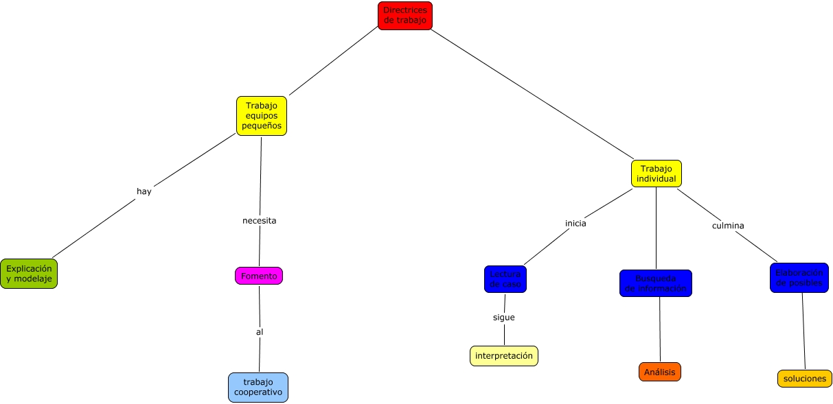 Este Cmap, tiene información relacionada con: Directrices de Trabajo, Lectura de caso sigue interpretación, Trabajo equipos pequeños hay Explicación y modelaje, Trabajo individual culmina Elaboración de posibles, Busqueda de información ???? Análisis, Fomento al trabajo cooperativo, Trabajo individual ???? Busqueda de información, Elaboración de posibles ???? soluciones, Trabajo equipos pequeños necesita Fomento, Directrices de trabajo ???? Trabajo individual, Directrices de trabajo ???? Trabajo equipos pequeños, Trabajo individual inicia Lectura de caso