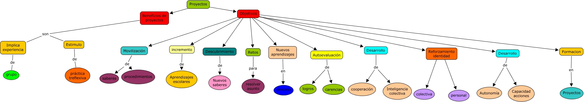 Este Cmap, tiene información relacionada con: Beneficios y objetivos de proyectos, Descubrimiento de Nuevos saberes, Implica experiencia de grupo, Desarrollo de Autonomía, Objetivos ???? Autoevaluación, Autoevaluación de carencias, Proyectos ???? Objetivos, Objetivos ???? Formacion, Reforzamiento identidad ???? colectiva, Retos para resolver asunto, Reforzamiento identidad ???? personal, Objetivos ???? Desarrollo, Autoevaluación de logros, Desarrollo de Inteligencia colectiva, incremento de Aprendizajes escolares, Desarrollo de Capacidad acciones, Estimulo de práctica treflexiva, Desarrollo de cooperación, Objetivos ???? Nuevos aprendizajes, Objetivos ???? incremento, Objetivos ???? Descubrimiento