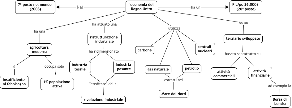 Questa Cmap, creata con IHMC CmapTools, contiene informazioni relative a: 251) Regno Unito - economia, industria tessile "ereditate" dalla rivoluzione industriale, ristrutturazione industriale ha ridimensionato industria tessile, l'economia del Regno Unito è al 7° posto nel mondo (2008), ristrutturazione industriale ha ridimensionato industria pesante, l'economia del Regno Unito utilizza petrolio, attività finanziarie ad esempio la Borsa di Londra, petrolio estratti nel Mare del Nord, agricoltura moderna occupa solo 1% popolazione attiva, l'economia del Regno Unito ha attuato una ristrutturazione industriale, industria pesante "ereditate" dalla rivoluzione industriale, l'economia del Regno Unito utilizza gas naturale, l'economia del Regno Unito ha un terziario sviluppato, l'economia del Regno Unito utilizza centrali nucleari, l'economia del Regno Unito ha un PIL/pc 36.000$ (20° posto), l'economia del Regno Unito ha una agricoltura moderna, gas naturale estratti nel Mare del Nord, terziario sviluppato basato soprattutto su attività finanziarie, agricoltura moderna è insufficiente al fabbisogno, l'economia del Regno Unito utilizza carbone, terziario sviluppato basato soprattutto su attività commerciali