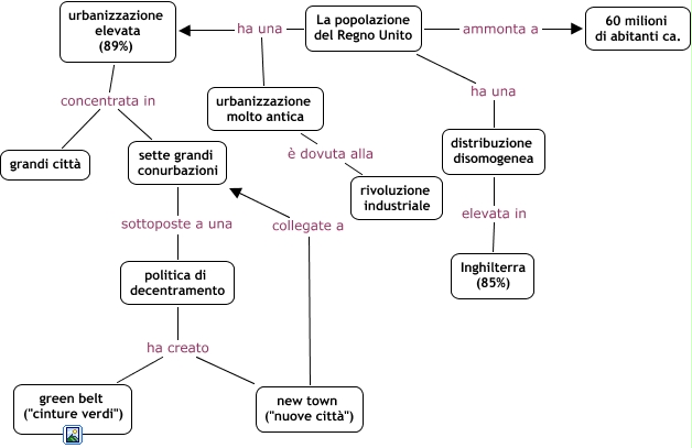 Questa Cmap, creata con IHMC CmapTools, contiene informazioni relative a: 251) Regno Unito - popolazione, politica di decentramento ha creato new town ("nuove città"), sette grandi conurbazioni sottoposte a una politica di decentramento, La popolazione del Regno Unito ha una distribuzione disomogenea, urbanizzazione molto antica è dovuta alla rivoluzione industriale, new town ("nuove città") collegate a sette grandi conurbazioni, La popolazione del Regno Unito ammonta a 60 milioni di abitanti ca., La popolazione del Regno Unito ha una urbanizzazione elevata (89%), La popolazione del Regno Unito ha una urbanizzazione molto antica, urbanizzazione elevata (89%) concentrata in grandi città, distribuzione disomogenea elevata in Inghilterra (85%), urbanizzazione elevata (89%) concentrata in sette grandi conurbazioni, politica di decentramento ha creato green belt ("cinture verdi")
