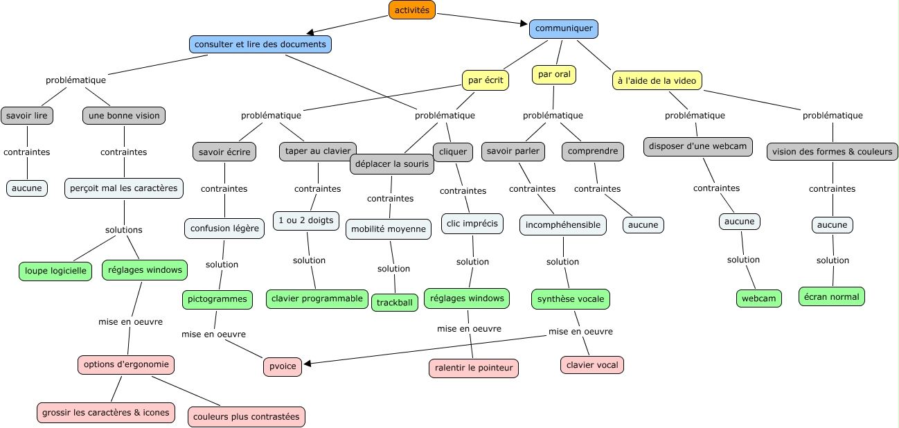 Cette carte de concepts créée avec IHMC CmapTools traite de: étude de cas, incomphéhensible solution synthèse vocale, clic imprécis solution réglages windows, pictogrammes mise en oeuvre pvoice, cliquer contraintes clic imprécis, déplacer la souris contraintes mobilité moyenne, communiquer par écrit, savoir parler contraintes incomphéhensible, vision des formes & couleurs contraintes aucune, savoir écrire contraintes confusion légère, synthèse vocale mise en oeuvre pvoice, consulter et lire des documents problématique déplacer la souris, perçoit mal les caractères solutions loupe logicielle, aucune solution écran normal, par écrit problématique cliquer, confusion légère solution pictogrammes, mobilité moyenne solution trackball, communiquer à l'aide de la video, réglages windows mise en oeuvre ralentir le pointeur, consulter et lire des documents problématique une bonne vision, une bonne vision contraintes perçoit mal les caractères
