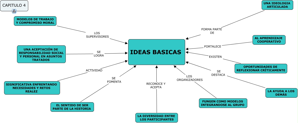 Este Cmap, tiene información relacionada con: IDEAS BASICAS, MODELOS DE TRABAJO Y COMPROMISO MORAL LOS SUPERVISORES IDEAS BASICAS, FUNGEN COMO MODELOS INTEGRANDOSE AL GRUPO LOS ORGANIZADORES IDEAS BASICAS, EL SENTIDO DE SER PARTE DE LA HISTORIA SE FOMENTA IDEAS BASICAS, LA AYUDA A LOS DEMÁS SE DESTACA IDEAS BASICAS, AL APRENDIZAJE COOPERATIVO FORTALECE IDEAS BASICAS, UNA IDEOLOGIA ARTICULADA FORMA PARTE DE IDEAS BASICAS, UNA ACEPTACIÓN DE RESPONSABILIDAD SOCIAL Y PERSONAL EN ASUNTOS TRATADOS SE LOGRA IDEAS BASICAS, LA DIVERSIDAD ENTRE LOS PARTICIPANTES RECONOCE Y ACEPTA IDEAS BASICAS, SIGNIFICATIVA ENFRENTANDO NECESIDADES Y RETOS REALEZ ACTIVIDAD IDEAS BASICAS, OPORTUNIDADES DE REFLEXIONAR CRÍTICAMENTE EXISTEN IDEAS BASICAS