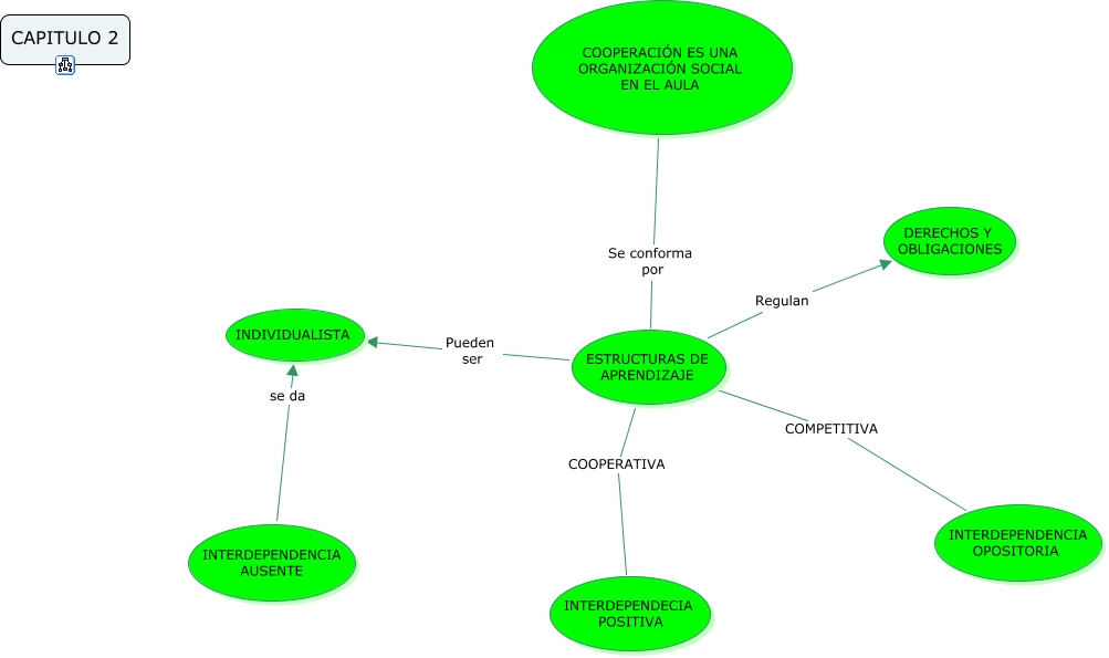 Este Cmap, tiene información relacionada con: ESTRATEGIA CENTRAL, ESTRUCTURAS DE APRENDIZAJE COOPERATIVA INTERDEPENDECIA POSITIVA, ESTRUCTURAS DE APRENDIZAJE Pueden ser INDIVIDUALISTA, ESTRUCTURAS DE APRENDIZAJE COMPETITIVA INTERDEPENDENCIA OPOSITORIA, COOPERACIÓN ES UNA ORGANIZACIÓN SOCIAL EN EL AULA Se conforma por ESTRUCTURAS DE APRENDIZAJE, INTERDEPENDENCIA AUSENTE se da INDIVIDUALISTA, ESTRUCTURAS DE APRENDIZAJE Regulan DERECHOS Y OBLIGACIONES