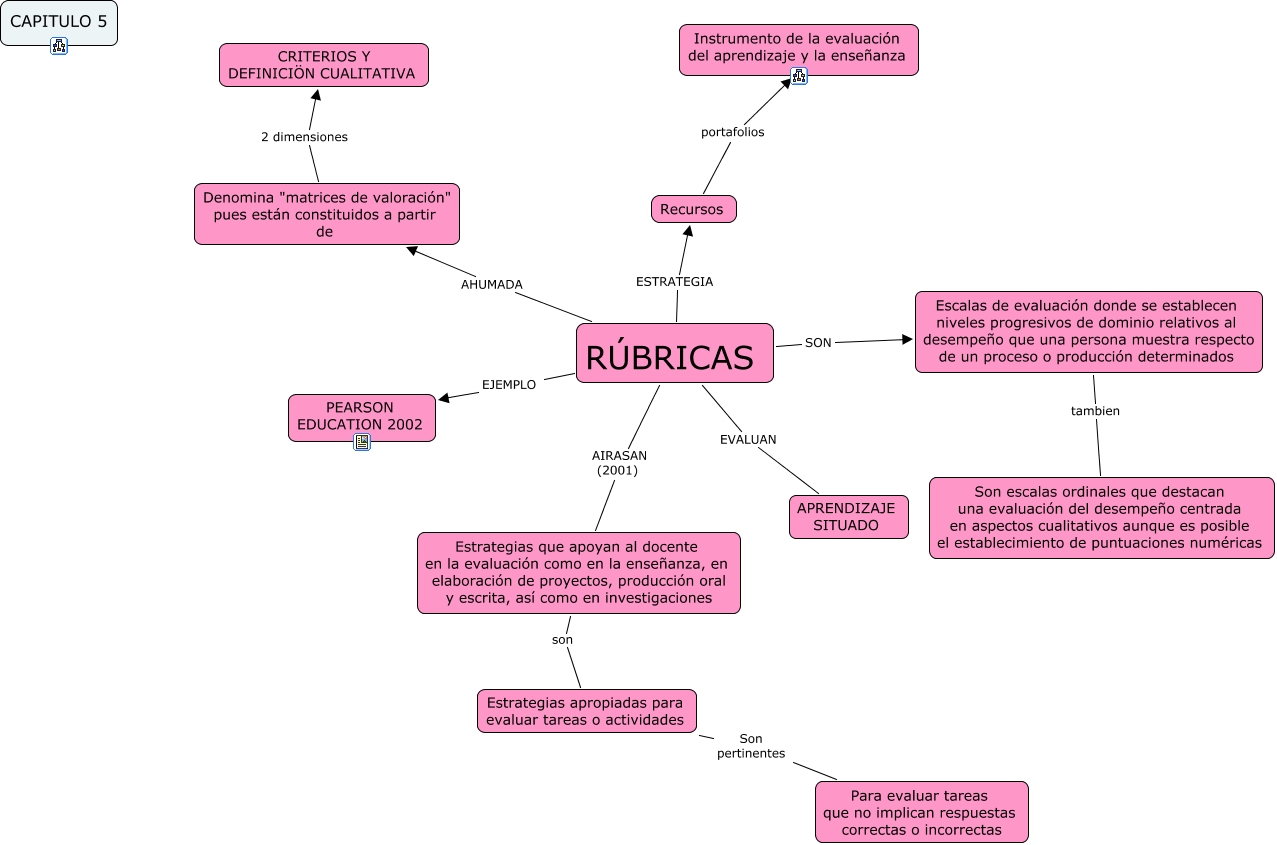 Este Cmap, tiene información relacionada con: RÚBRICAS, Estrategias apropiadas para evaluar tareas o actividades Son pertinentes Para evaluar tareas que no implican respuestas correctas o incorrectas, Estrategias que apoyan al docente en la evaluación como en la enseñanza, en elaboración de proyectos, producción oral y escrita, así como en investigaciones son Estrategias apropiadas para evaluar tareas o actividades, Escalas de evaluación donde se establecen niveles progresivos de dominio relativos al desempeño que una persona muestra respecto de un proceso o producción determinados tambien Son escalas ordinales que destacan una evaluación del desempeño centrada en aspectos cualitativos aunque es posible el establecimiento de puntuaciones numéricas, RÚBRICAS EJEMPLO PEARSON EDUCATION 2002, RÚBRICAS EVALUAN APRENDIZAJE SITUADO, RÚBRICAS SON Escalas de evaluación donde se establecen niveles progresivos de dominio relativos al desempeño que una persona muestra respecto de un proceso o producción determinados, RÚBRICAS AHUMADA Denomina "matrices de valoración" pues están constituidos a partir de, Recursos portafolios Instrumento de la evaluación del aprendizaje y la enseñanza, RÚBRICAS ESTRATEGIA Recursos, Denomina "matrices de valoración" pues están constituidos a partir de 2 dimensiones CRITERIOS Y DEFINICIÖN CUALITATIVA, RÚBRICAS AIRASAN (2001) Estrategias que apoyan al docente en la evaluación como en la enseñanza, en elaboración de proyectos, producción oral y escrita, así como en investigaciones
