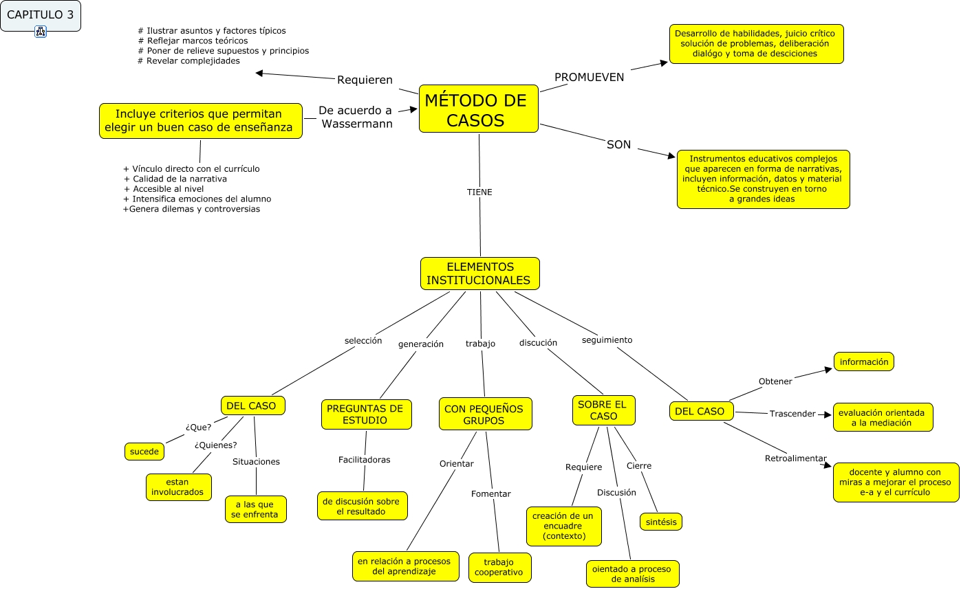 Este Cmap, tiene información relacionada con: METODO DE CASOS, ELEMENTOS INSTITUCIONALES generación PREGUNTAS DE ESTUDIO, DEL CASO Trascender evaluación orientada a la mediación, ELEMENTOS INSTITUCIONALES trabajo CON PEQUEÑOS GRUPOS, MÉTODO DE CASOS SON Instrumentos educativos complejos que aparecen en forma de narrativas, incluyen información, datos y material técnico.Se construyen en torno a grandes ideas, SOBRE EL CASO Requiere creación de un encuadre (contexto), CON PEQUEÑOS GRUPOS Orientar en relación a procesos del aprendizaje, Incluye criterios que permitan elegir un buen caso de enseñanza + Vínculo directo con el currículo + Calidad de la narrativa + Accesible al nivel + Intensifica emociones del alumno +Genera dilemas y controversias, SOBRE EL CASO Cierre sintésis, DEL CASO ¿Quienes? estan involucrados, CON PEQUEÑOS GRUPOS Fomentar trabajo cooperativo, MÉTODO DE CASOS Requieren # Ilustrar asuntos y factores típicos # Reflejar marcos teóricos # Poner de relieve supuestos y principios # Revelar complejidades, DEL CASO ¿Que? sucede, DEL CASO Retroalimentar docente y alumno con miras a mejorar el proceso e-a y el currículo, SOBRE EL CASO Discusión oientado a proceso de analísis, MÉTODO DE CASOS PROMUEVEN Desarrollo de habilidades, juicio crítico solución de problemas, deliberación dialógo y toma de desciciones, MÉTODO DE CASOS TIENE ELEMENTOS INSTITUCIONALES, ELEMENTOS INSTITUCIONALES discución SOBRE EL CASO, ELEMENTOS INSTITUCIONALES seguimiento DEL CASO, DEL CASO Situaciones a las que se enfrenta, ELEMENTOS INSTITUCIONALES selección DEL CASO
