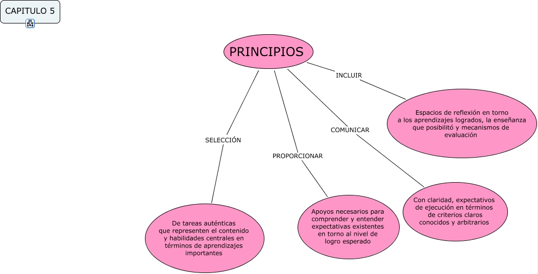 Este Cmap, tiene información relacionada con: PRINCIPIOS, PRINCIPIOS COMUNICAR Con claridad, expectativos de ejecución en términos de criterios claros conocidos y arbitrarios, PRINCIPIOS PROPORCIONAR Apoyos necesarios para comprender y entender expectativas existentes en torno al nivel de logro esperado, PRINCIPIOS SELECCIÓN De tareas auténticas que representen el contenido y habilidades centrales en términos de aprendizajes importantes, PRINCIPIOS INCLUIR Espacios de reflexión en torno a los aprendizajes logrados, la enseñanza que posibilitó y mecanismos de evaluación