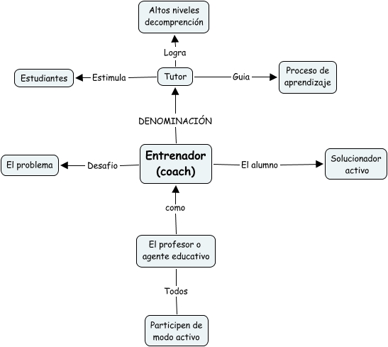 Este Cmap, tiene información relacionada con: Entrenador, El profesor o agente educativo como Entrenador (coach), Entrenador (coach) El alumno Solucionador activo, Entrenador (coach) DENOMINACIÓN Tutor, Tutor Estimula Estudiantes, Tutor Guia Proceso de aprendizaje, Tutor Logra Altos niveles decomprención, El profesor o agente educativo Todos Participen de modo activo, Entrenador (coach) Desafio El problema