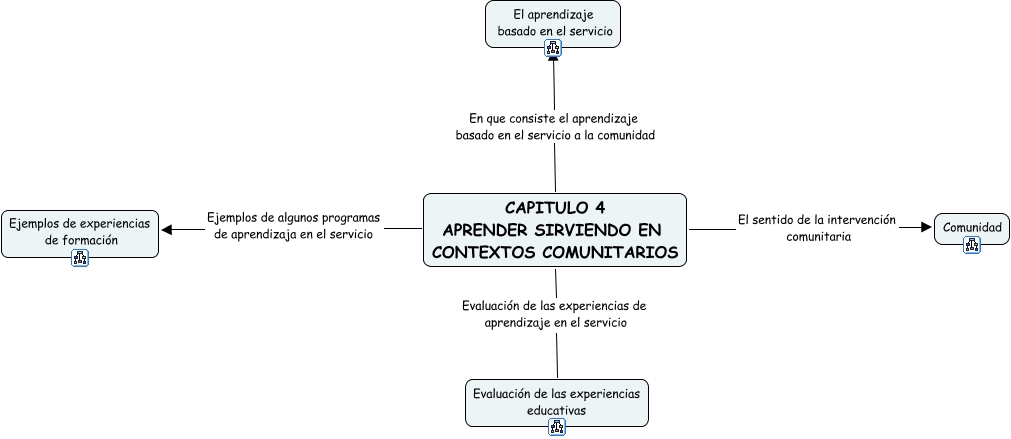 Este Cmap, tiene información relacionada con: CAPITULO 4, CAPITULO 4 APRENDER SIRVIENDO EN CONTEXTOS COMUNITARIOS Ejemplos de algunos programas de aprendizaja en el servicio Ejemplos de experiencias de formación, CAPITULO 4 APRENDER SIRVIENDO EN CONTEXTOS COMUNITARIOS En que consiste el aprendizaje basado en el servicio a la comunidad El aprendizaje basado en el servicio, CAPITULO 4 APRENDER SIRVIENDO EN CONTEXTOS COMUNITARIOS Evaluación de las experiencias de aprendizaje en el servicio Evaluación de las experiencias educativas, CAPITULO 4 APRENDER SIRVIENDO EN CONTEXTOS COMUNITARIOS El sentido de la intervención comunitaria Comunidad