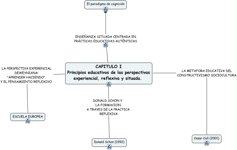 Este Cmap, tiene información relacionada con: CAPITULO I, CAPITULO I Principios educativos de las perspectivas experiencial, reflexiva y situada. DONALD SCHON Y LA FORMACION A TRAVES DE LA PRACTICA REFLEXIVA Donald Schon (1992), CAPITULO I Principios educativos de las perspectivas experiencial, reflexiva y situada. ENSEÑANZA SITUADA CENTRADA EN PRÁCTICAS EDUCATIVAS AUTÉNTICAS El paradigma de cognición, CAPITULO I Principios educativos de las perspectivas experiencial, reflexiva y situada. LA METAFORA EDUCATIVA DEL CONSTRUCTIVISMO SOCIOCULTURA Cesar Coll (2001), CAPITULO I Principios educativos de las perspectivas experiencial, reflexiva y situada. LA PERSPECTIVA EXPERENCIAL DEWEYNIANA: "APRENDER HACIENDO" Y EL PENSAMIENTO REFLEXIVO ESCUELA EUROPEA