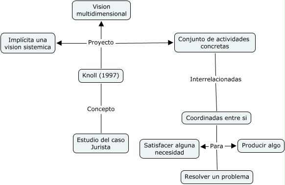 Este Cmap, tiene información relacionada con: Knoll, Knoll (1997) Proyecto Conjunto de actividades concretas, Coordinadas entre si Para Resolver un problema, Coordinadas entre si Para Satisfacer alguna necesidad, Knoll (1997) Proyecto Vision multidimensional, Knoll (1997) Proyecto Implícita una vision sistemica, Coordinadas entre si Para Producir algo, Knoll (1997) Concepto Estudio del caso Jurista, Conjunto de actividades concretas Interrelacionadas Coordinadas entre si