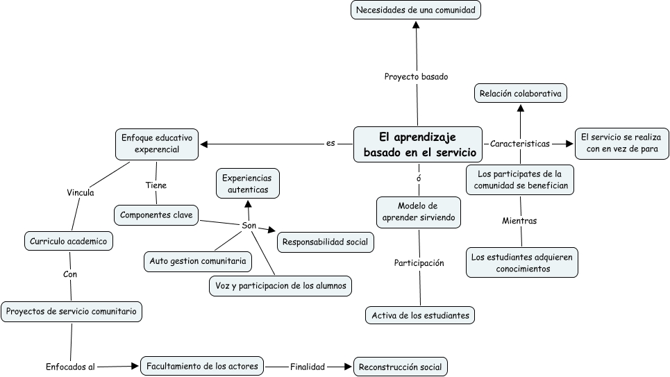 Este Cmap, tiene información relacionada con: El aprendizaje basado en el servicio, El aprendizaje basado en el servicio es Enfoque educativo experencial, Los participates de la comunidad se benefician Mientras Los estudiantes adquieren conocimientos, Componentes clave Son Experiencias autenticas, El aprendizaje basado en el servicio Caracteristicas Relación colaborativa, Enfoque educativo experencial Tiene Componentes clave, Componentes clave Son Auto gestion comunitaria, El aprendizaje basado en el servicio ó Modelo de aprender sirviendo, El aprendizaje basado en el servicio Caracteristicas Los participates de la comunidad se benefician, El aprendizaje basado en el servicio Caracteristicas El servicio se realiza con en vez de para, Componentes clave Son Voz y participacion de los alumnos, Enfoque educativo experencial Vincula Curriculo academico, Componentes clave Son Responsabilidad social, Facultamiento de los actores Finalidad Reconstrucción social, Modelo de aprender sirviendo Participación Activa de los estudiantes, Proyectos de servicio comunitario Enfocados al Facultamiento de los actores, El aprendizaje basado en el servicio Proyecto basado Necesidades de una comunidad, Curriculo academico Con Proyectos de servicio comunitario