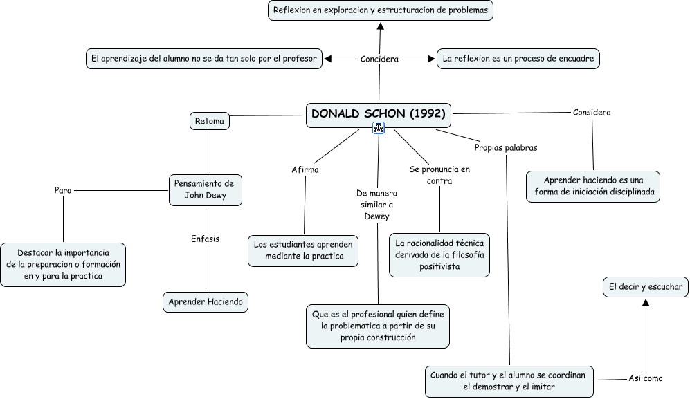 Este Cmap, tiene información relacionada con: DONALD SCHON, DONALD SCHON (1992) Concidera Reflexion en exploracion y estructuracion de problemas, DONALD SCHON (1992) Afirma Los estudiantes aprenden mediante la practica, Pensamiento de John Dewy Para Destacar la importancia de la preparacion o formación en y para la practica, DONALD SCHON (1992) De manera similar a Dewey Que es el profesional quien define la problematica a partir de su propia construcción, DONALD SCHON (1992) Propias palabras Cuando el tutor y el alumno se coordinan el demostrar y el imitar, DONALD SCHON (1992) ???? Pensamiento de John Dewy, DONALD SCHON (1992) Considera Aprender haciendo es una forma de iniciación disciplinada, DONALD SCHON (1992) Concidera La reflexion es un proceso de encuadre, DONALD SCHON (1992) Se pronuncia en contra La racionalidad técnica derivada de la filosofía positivista, Cuando el tutor y el alumno se coordinan el demostrar y el imitar Asi como El decir y escuchar, DONALD SCHON (1992) Concidera El aprendizaje del alumno no se da tan solo por el profesor, Pensamiento de John Dewy Enfasis Aprender Haciendo