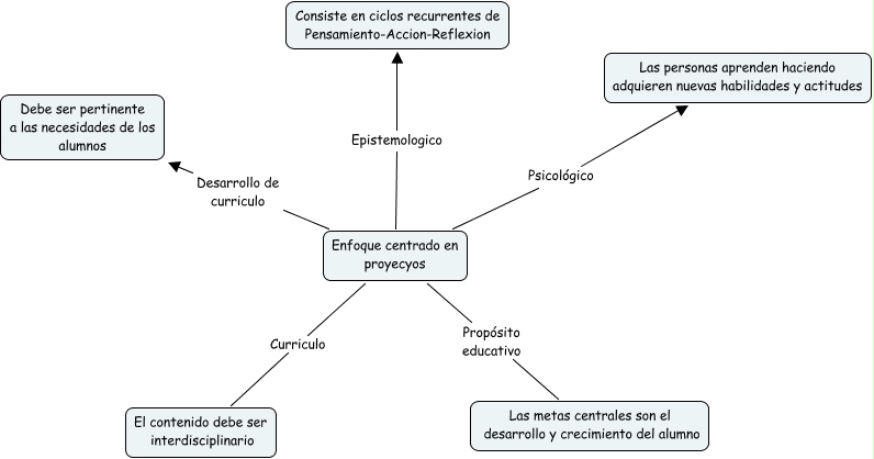 Este Cmap, tiene información relacionada con: Enfoque centrado en proyecyos, Enfoque centrado en proyecyos Epistemologico Consiste en ciclos recurrentes de Pensamiento-Accion-Reflexion, Enfoque centrado en proyecyos Curriculo El contenido debe ser interdisciplinario, Enfoque centrado en proyecyos Propósito educativo Las metas centrales son el desarrollo y crecimiento del alumno, Enfoque centrado en proyecyos Psicológico Las personas aprenden haciendo adquieren nuevas habilidades y actitudes, Enfoque centrado en proyecyos Desarrollo de curriculo Debe ser pertinente a las necesidades de los alumnos