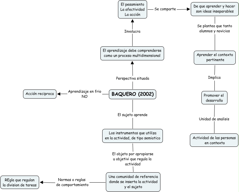 Este Cmap, tiene información relacionada con: BAQUERO, BAQUERO (2002) Perspectiva situada El aprendizaje debe comprenderse como un proceso multidimensional, De que aprender y hacer son ideas inseparables Se plantea que tanto alumnos y novicios Aprender el contexto pertinente, Promover el desarrollo Unidad de analisis Actividad de las personas en contexto, Aprender el contexto pertinente Implica Promover el desarrollo, BAQUERO (2002) Aprendizaje en frio NO Acción reciproca, El aprendizaje debe comprenderse como un proceso multidimensional Involucra El pesamiento La afectividad La acción, Los instrumentos que utiliza en la actividad, de tipo semiotico El objeto por apropiarse u objetivi que regula la actividad Una comunidad de referencia donde se inserta la actividad y el sujeto, Una comunidad de referencia donde se inserta la actividad y el sujeto Normas o reglas de comportamiento REgla que regulan la division de tareas, El pesamiento La afectividad La acción Se comparte De que aprender y hacer son ideas inseparables, BAQUERO (2002) El sujeto aprende Los instrumentos que utiliza en la actividad, de tipo semiotico