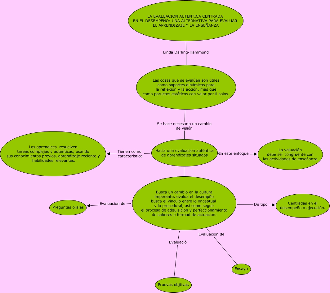 Este Cmap, tiene información relacionada con: CAPITULO 5, Hacia una evaluacion auténtica de aprendizajes situados La evaluacion autentica Busca un cambio en la cultura imperante, evalua el desempño busca el vinculo entre lo onceptual y lo procedural, asi como seguir el proceso de adquisicion y perfeccionamiento de saberes o formad de actuacion., Hacia una evaluacion auténtica de aprendizajes situados Tienen como caracteristica Los aprendices resuelven tareas complejas y autenticas, usando sus conocimientos previos, aprendizaje reciente y habilidades relevantes., Las cosas que se evalúan son útiles como soportes dinámicos para la reflexión y la acción, mas que como poructos estáticos con valor por íi solos. Se hace necesario un cambio de visión Hacia una evaluacion auténtica de aprendizajes situados, LA EVALUACION AUTENTICA CENTRADA EN EL DESEMPEÑO: UNA ALTERNATIVA PARA EVALUAR EL APRENDIZAJE Y LA ENSEÑANZA Linda Darling-Hammond Las cosas que se evalúan son útiles como soportes dinámicos para la reflexión y la acción, mas que como poructos estáticos con valor por íi solos., Busca un cambio en la cultura imperante, evalua el desempño busca el vinculo entre lo onceptual y lo procedural, asi como seguir el proceso de adquisicion y perfeccionamiento de saberes o formad de actuacion. Evaluació Pruevas objtivas, Busca un cambio en la cultura imperante, evalua el desempño busca el vinculo entre lo onceptual y lo procedural, asi como seguir el proceso de adquisicion y perfeccionamiento de saberes o formad de actuacion. Evaluacion de Preguntas orales, Hacia una evaluacion auténtica de aprendizajes situados En este enfoque La valuación debe ser congruente con las actividades de enseñanza, Busca un cambio en la cultura imperante, evalua el desempño busca el vinculo entre lo onceptual y lo procedural, asi como seguir el proceso de adquisicion y perfeccionamiento de saberes o formad de actuacion. Evaluacion de Ensayo, Busca un cambio en la cultura imperante, evalua el desempño busca el vinculo entre lo onceptual y lo procedural, asi como seguir el proceso de adquisicion y perfeccionamiento de saberes o formad de actuacion. De tipo Centradas en el desempeño o ejecución.