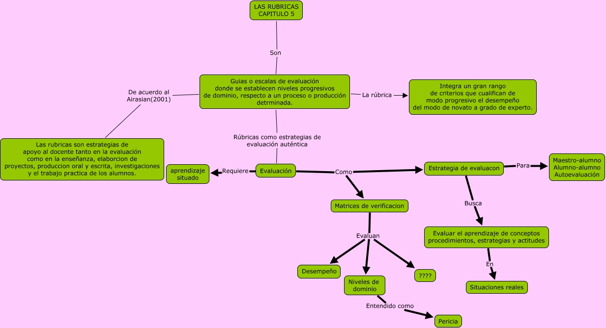 Este Cmap, tiene información relacionada con: CAPITULO 5 DOS, Evaluación Como Matrices de verificacion, Guias o escalas de evaluación donde se establecen niveles progresivos de dominio, respecto a un proceso o producción detrminada. Rúbricas como estrategias de evaluación auténtica Evaluación, Estrategia de evaluacon Busca Evaluar el aprendizaje de conceptos procedimientos, estrategias y actitudes, LAS RUBRICAS CAPITULO 5 Son Guias o escalas de evaluación donde se establecen niveles progresivos de dominio, respecto a un proceso o producción detrminada., Estrategia de evaluacon Para Maestro-alumno Alumno-alumno Autoevaluación, Matrices de verificacion Evaluan Niveles de dominio, Evaluar el aprendizaje de conceptos procedimientos, estrategias y actitudes En Situaciones reales, Matrices de verificacion Evaluan Desempeño, Guias o escalas de evaluación donde se establecen niveles progresivos de dominio, respecto a un proceso o producción detrminada. La rúbrica Integra un gran rango de criterios que cualifican de modo progresivo el desempeño del modo de novato a grado de experto., Guias o escalas de evaluación donde se establecen niveles progresivos de dominio, respecto a un proceso o producción detrminada. De acuerdo al Airasian(2001) Las rubricas son estrategias de apoyo al docente tanto en la evaluación como en la enseñanza, elaborcion de proyectos, produccion oral y escrita, investigaciones y el trabajo practica de los alumnos., Matrices de verificacion Evaluan ????, Niveles de dominio Entendido como Pericia, Evaluación Como Estrategia de evaluacon, Evaluación Requiere aprendizaje situado
