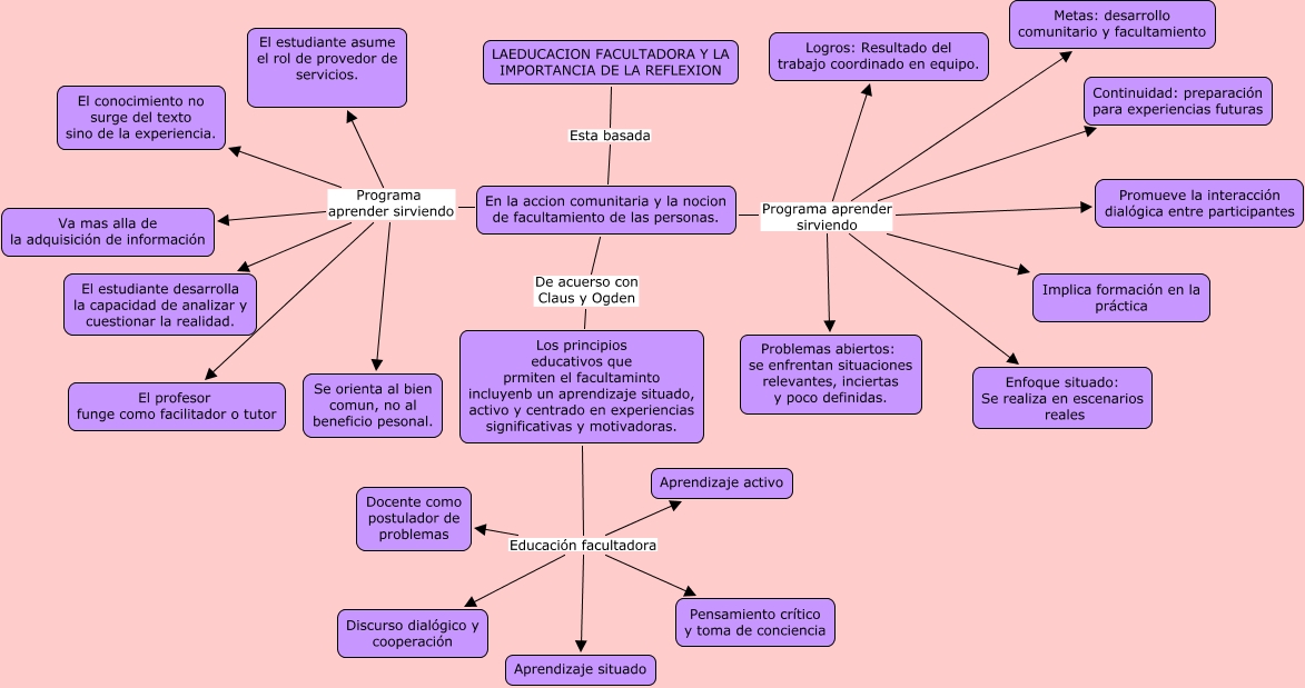 Este Cmap, tiene información relacionada con: CAPITULO 4 DOS, En la accion comunitaria y la nocion de facultamiento de las personas. Programa aprender sirviendo Problemas abiertos: se enfrentan situaciones relevantes, inciertas y poco definidas., En la accion comunitaria y la nocion de facultamiento de las personas. De acuerso con Claus y Ogden Los principios educativos que prmiten el facultaminto incluyenb un aprendizaje situado, activo y centrado en experiencias significativas y motivadoras., En la accion comunitaria y la nocion de facultamiento de las personas. Programa aprender sirviendo Continuidad: preparación para experiencias futuras, Los principios educativos que prmiten el facultaminto incluyenb un aprendizaje situado, activo y centrado en experiencias significativas y motivadoras. Educación facultadora Discurso dialógico y cooperación, En la accion comunitaria y la nocion de facultamiento de las personas. Programa aprender sirviendo El conocimiento no surge del texto sino de la experiencia., En la accion comunitaria y la nocion de facultamiento de las personas. Programa aprender sirviendo El estudiante desarrolla la capacidad de analizar y cuestionar la realidad., Los principios educativos que prmiten el facultaminto incluyenb un aprendizaje situado, activo y centrado en experiencias significativas y motivadoras. Educación facultadora Pensamiento crítico y toma de conciencia, Los principios educativos que prmiten el facultaminto incluyenb un aprendizaje situado, activo y centrado en experiencias significativas y motivadoras. Educación facultadora Docente como postulador de problemas, En la accion comunitaria y la nocion de facultamiento de las personas. Programa aprender sirviendo Logros: Resultado del trabajo coordinado en equipo., En la accion comunitaria y la nocion de facultamiento de las personas. Programa aprender sirviendo El profesor funge como facilitador o tutor, Los principios educativos que prmiten el facultaminto incluyenb un aprendizaje situado, activo y centrado en experiencias significativas y motivadoras. Educación facultadora Aprendizaje activo, En la accion comunitaria y la nocion de facultamiento de las personas. Programa aprender sirviendo Enfoque situado: Se realiza en escenarios reales, En la accion comunitaria y la nocion de facultamiento de las personas. Programa aprender sirviendo El estudiante asume el rol de provedor de servicios., LAEDUCACION FACULTADORA Y LA IMPORTANCIA DE LA REFLEXION Esta basada En la accion comunitaria y la nocion de facultamiento de las personas., En la accion comunitaria y la nocion de facultamiento de las personas. Programa aprender sirviendo Se orienta al bien comun, no al beneficio pesonal., En la accion comunitaria y la nocion de facultamiento de las personas. Programa aprender sirviendo Metas: desarrollo comunitario y facultamiento, En la accion comunitaria y la nocion de facultamiento de las personas. Programa aprender sirviendo Va mas alla de la adquisición de información, En la accion comunitaria y la nocion de facultamiento de las personas. Programa aprender sirviendo Implica formación en la práctica, En la accion comunitaria y la nocion de facultamiento de las personas. Programa aprender sirviendo Promueve la interacción dialógica entre participantes, Los principios educativos que prmiten el facultaminto incluyenb un aprendizaje situado, activo y centrado en experiencias significativas y motivadoras. Educación facultadora Aprendizaje situado
