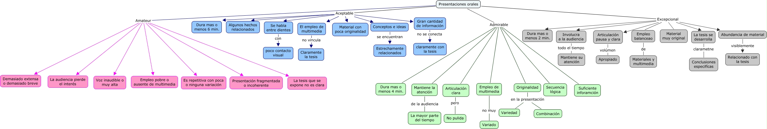Este Cmap, tiene información relacionada con: Resentaciones orales, Presentaciones orales Aceptable Se habla entre dientes, Empleo de multimedia no muy Variado, Conceptos e ideas se encuentran Estrechamente relacionados, Presentaciones orales Admirable Originalidad, Originalidad en la presentación Combinación, Presentaciones orales Admirable Mantiene la atención, Gran cantidad de información no se conecta claramente con la tesis, Presentaciones orales Aceptable Material con poca originalidad, Presentaciones orales Aceptable Conceptos e ideas, Presentaciones orales Amateur Demasiado extensa o demasiado breve, Abundancia de material visiblemente Relacionado con la tesis, Mantiene la atención de la audiencia La mayor parte del tiempo, Presentaciones orales Admirable Secuencia lógica, Presentaciones orales Excepcional Material muy original, Presentaciones orales Admirable Articulación clara, Presentaciones orales Amateur Presentación fragmentada o incoherente, Presentaciones orales Aceptable Dura mas o menos 6 min., Presentaciones orales Excepcional Empleo balanceao, Presentaciones orales Excepcional Involucra a la audiencia, Empleo balanceao de Materiales y multimedia