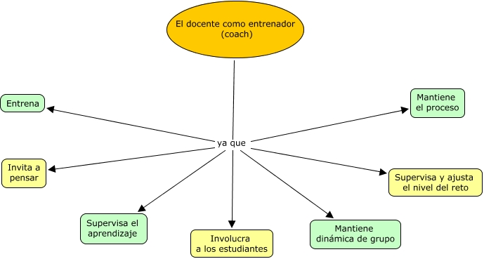 Este Cmap, tiene información relacionada con: coach, El docente como entrenador (coach) ya que Mantiene dinámica de grupo, El docente como entrenador (coach) ya que Supervisa el aprendizaje, El docente como entrenador (coach) ya que Invita a pensar, El docente como entrenador (coach) ya que Mantiene el proceso, El docente como entrenador (coach) ya que Supervisa y ajusta el nivel del reto, El docente como entrenador (coach) ya que Involucra a los estudiantes, El docente como entrenador (coach) ya que Entrena