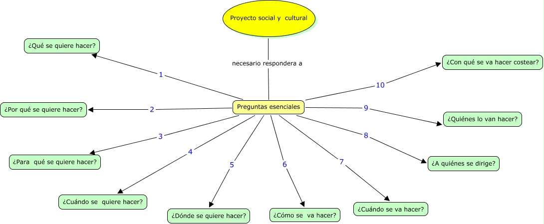 Este Cmap, tiene información relacionada con: preguntas de un proyecto social y cultural, Preguntas esenciales 4 ¿Cuándo se quiere hacer?, Preguntas esenciales 2 ¿Por qué se quiere hacer?, Proyecto social y cultural necesario respondera a Preguntas esenciales, Preguntas esenciales 5 ¿Dónde se quiere hacer?, Preguntas esenciales 10 ¿Con qué se va hacer costear?, Preguntas esenciales 7 ¿Cuándo se va hacer?, Preguntas esenciales 1 ¿Qué se quiere hacer?, Preguntas esenciales 6 ¿Cómo se va hacer?, Preguntas esenciales 3 ¿Para qué se quiere hacer?, Preguntas esenciales 9 ¿Quiénes lo van hacer?, Preguntas esenciales 8 ¿A quiénes se dirige?