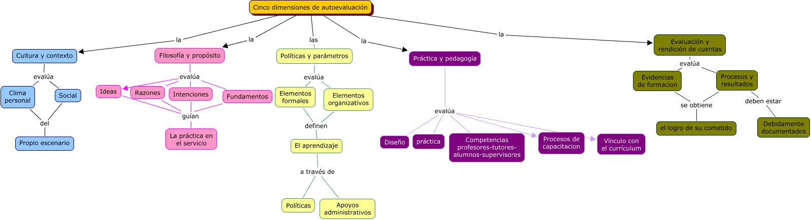 Este Cmap, tiene información relacionada con: Dimensiones de la autoevaluacion.cmap, El aprendizaje a través de Políticas, Práctica y pedagogía evalúa Diseño, Evaluación y rendición de cuentas evalúa Procesos y resultados, Fundamentos guían La práctica en el servicio, Intenciones guían La práctica en el servicio, Procesos y resultados deben estar Debidamente documentados, Filosofía y propósito evalúa Razones, El aprendizaje a través de Apoyos administrativos, Cinco dimensiones de autoevaluación la Práctica y pedagogía, Práctica y pedagogía evalúa Procesos de capacitacion, Cultura y contexto evalúa Clima personal, Ideas guían La práctica en el servicio, Políticas y parámetros evalúa Elementos organizativos, Cinco dimensiones de autoevaluación las Políticas y parámetros, Práctica y pedagogía evalúa Competencias profesores-tutores- alumnos-supervisores, Cinco dimensiones de autoevaluación la Evaluación y rendición de cuentas, Cinco dimensiones de autoevaluación la Cultura y contexto, Filosofía y propósito evalúa Ideas, Evaluación y rendición de cuentas evalúa Evidencias de formacion, Práctica y pedagogía evalúa Vínculo con el currículum