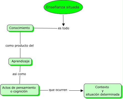 Este Cmap, tiene información relacionada con: Definición, Enseñanza situada es todo Conocimiento, Conocimiento como producto del Aprendizaje, Actos de pensamiento o cognición que ocurren Contexto y situación determinada, Aprendizaje asi como Actos de pensamiento o cognición