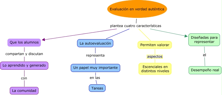 Este Cmap, tiene información relacionada con: Evaluacion en verdad autentica, Evaluación en verdad auténtica plantea cuatro características La autoevaluación, Un papel muy importante en las Tareas, Evaluación en verdad auténtica plantea cuatro características Que los alumnos, Permiten valorar aspectos Escenciales en distintos niveles, Lo aprendido y generado con La comunidad, Diseñadas para representar el Desempeño real, Que los alumnos compartan y discutan Lo aprendido y generado, Evaluación en verdad auténtica plantea cuatro características Diseñadas para representar, Evaluación en verdad auténtica plantea cuatro características Permiten valorar, La autoevaluación representa Un papel muy importante