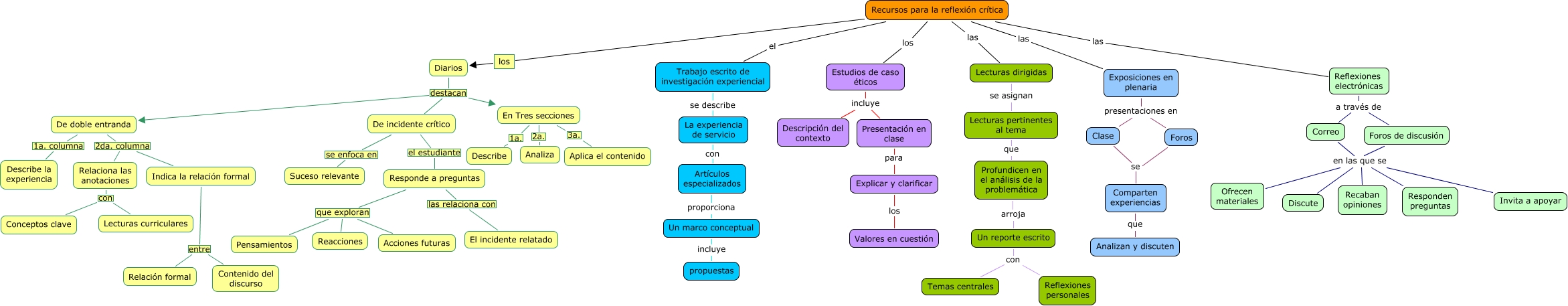 Este Cmap, tiene información relacionada con: Recursos para la reflexion.cmap, Diarios destacan De doble entranda, Correo en las que se Discute, Lecturas pertinentes al tema que Profundicen en el análisis de la problemática, Un reporte escrito con Reflexiones personales, Diarios destacan En Tres secciones, Estudios de caso éticos incluye Descripción del contexto, Lecturas dirigidas se asignan Lecturas pertinentes al tema, En Tres secciones 2a. Analiza, Trabajo escrito de investigación experiencial se describe La experiencia de servicio, Responde a preguntas las relaciona con El incidente relatado, De incidente crítico el estudiante Responde a preguntas, Correo en las que se Responden preguntas, Un reporte escrito con Temas centrales, Artículos especializados proporciona Un marco conceptual, La experiencia de servicio con Artículos especializados, Estudios de caso éticos incluye Presentación en clase, Indica la relación formal entre Contenido del discurso, Correo en las que se Ofrecen materiales, Foros de discusión en las que se Invita a apoyar, Recursos para la reflexión crítica las Lecturas dirigidas