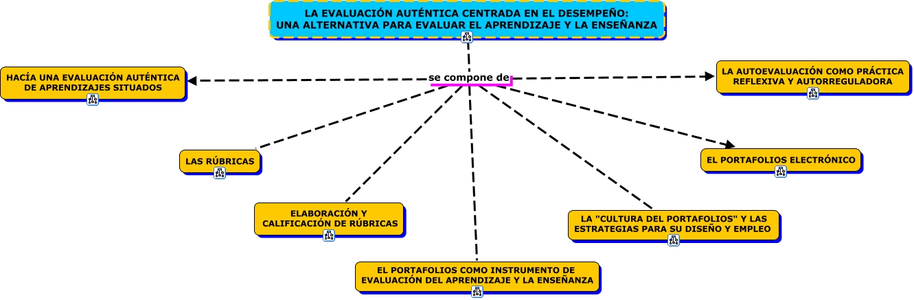 Este Cmap, tiene información relacionada con: CAP. 5, LA EVALUACIÓN AUTÉNTICA CENTRADA EN EL DESEMPEÑO: UNA ALTERNATIVA PARA EVALUAR EL APRENDIZAJE Y LA ENSEÑANZA se compone de LAS RÚBRICAS, LA EVALUACIÓN AUTÉNTICA CENTRADA EN EL DESEMPEÑO: UNA ALTERNATIVA PARA EVALUAR EL APRENDIZAJE Y LA ENSEÑANZA se compone de LA "CULTURA DEL PORTAFOLIOS" Y LAS ESTRATEGIAS PARA SU DISEÑO Y EMPLEO, LA EVALUACIÓN AUTÉNTICA CENTRADA EN EL DESEMPEÑO: UNA ALTERNATIVA PARA EVALUAR EL APRENDIZAJE Y LA ENSEÑANZA se compone de LA AUTOEVALUACIÓN COMO PRÁCTICA REFLEXIVA Y AUTORREGULADORA, LA EVALUACIÓN AUTÉNTICA CENTRADA EN EL DESEMPEÑO: UNA ALTERNATIVA PARA EVALUAR EL APRENDIZAJE Y LA ENSEÑANZA se compone de EL PORTAFOLIOS COMO INSTRUMENTO DE EVALUACIÓN DEL APRENDIZAJE Y LA ENSEÑANZA, LA EVALUACIÓN AUTÉNTICA CENTRADA EN EL DESEMPEÑO: UNA ALTERNATIVA PARA EVALUAR EL APRENDIZAJE Y LA ENSEÑANZA se compone de ELABORACIÓN Y CALIFICACIÓN DE RÚBRICAS, LA EVALUACIÓN AUTÉNTICA CENTRADA EN EL DESEMPEÑO: UNA ALTERNATIVA PARA EVALUAR EL APRENDIZAJE Y LA ENSEÑANZA se compone de EL PORTAFOLIOS ELECTRÓNICO, LA EVALUACIÓN AUTÉNTICA CENTRADA EN EL DESEMPEÑO: UNA ALTERNATIVA PARA EVALUAR EL APRENDIZAJE Y LA ENSEÑANZA se compone de HACÍA UNA EVALUACIÓN AUTÉNTICA DE APRENDIZAJES SITUADOS
