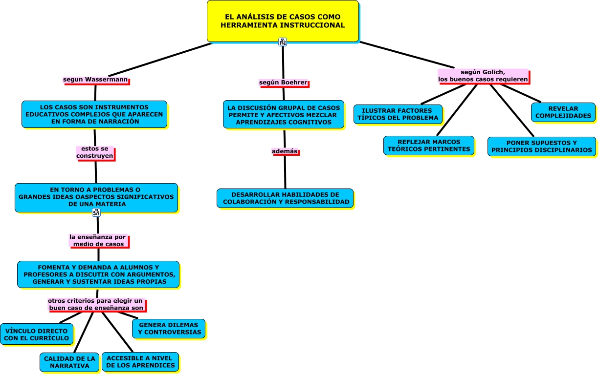 Este Cmap, tiene información relacionada con: CAP. 3 E, FOMENTA Y DEMANDA A ALUMNOS Y PROFESORES A DISCUTIR CON ARGUMENTOS, GENERAR Y SUSTENTAR IDEAS PROPIAS otros criterios para elegir un buen caso de enseñanza son ACCESIBLE A NIVEL DE LOS APRENDICES, EL ANÁLISIS DE CASOS COMO HERRAMIENTA INSTRUCCIONAL segun Wassermann LOS CASOS SON INSTRUMENTOS EDUCATIVOS COMPLEJOS QUE APARECEN EN FORMA DE NARRACIÓN, EL ANÁLISIS DE CASOS COMO HERRAMIENTA INSTRUCCIONAL según Golich, los buenos casos requieren PONER SUPUESTOS Y PRINCIPIOS DISCIPLINARIOS, LA DISCUSIÓN GRUPAL DE CASOS PERMITE Y AFECTIVOS MEZCLAR APRENDIZAJES COGNITIVOS además DESARROLLAR HABILIDADES DE COLABORACIÓN Y RESPONSABILIDAD, FOMENTA Y DEMANDA A ALUMNOS Y PROFESORES A DISCUTIR CON ARGUMENTOS, GENERAR Y SUSTENTAR IDEAS PROPIAS otros criterios para elegir un buen caso de enseñanza son CALIDAD DE LA NARRATIVA, EL ANÁLISIS DE CASOS COMO HERRAMIENTA INSTRUCCIONAL según Boehrer LA DISCUSIÓN GRUPAL DE CASOS PERMITE Y AFECTIVOS MEZCLAR APRENDIZAJES COGNITIVOS, EN TORNO A PROBLEMAS O GRANDES IDEAS OASPECTOS SIGNIFICATIVOS DE UNA MATERIA la enseñanza por medio de casos FOMENTA Y DEMANDA A ALUMNOS Y PROFESORES A DISCUTIR CON ARGUMENTOS, GENERAR Y SUSTENTAR IDEAS PROPIAS, EL ANÁLISIS DE CASOS COMO HERRAMIENTA INSTRUCCIONAL según Golich, los buenos casos requieren ILUSTRAR FACTORES TÍPICOS DEL PROBLEMA, EL ANÁLISIS DE CASOS COMO HERRAMIENTA INSTRUCCIONAL según Golich, los buenos casos requieren REVELAR COMPLEJIDADES, FOMENTA Y DEMANDA A ALUMNOS Y PROFESORES A DISCUTIR CON ARGUMENTOS, GENERAR Y SUSTENTAR IDEAS PROPIAS otros criterios para elegir un buen caso de enseñanza son GENERA DILEMAS Y CONTROVERSIAS, EL ANÁLISIS DE CASOS COMO HERRAMIENTA INSTRUCCIONAL según Golich, los buenos casos requieren REFLEJAR MARCOS TEÓRICOS PERTINENTES, LOS CASOS SON INSTRUMENTOS EDUCATIVOS COMPLEJOS QUE APARECEN EN FORMA DE NARRACIÓN estos se construyen EN TORNO A PROBLEMAS O GRANDES IDEAS OASPECTOS SIGNIFICATIVOS DE UNA MATERIA, FOMENTA Y DEMANDA A ALUMNOS Y PROFESORES A DISCUTIR CON ARGUMENTOS, GENERAR Y SUSTENTAR IDEAS PROPIAS otros criterios para elegir un buen caso de enseñanza son VÍNCULO DIRECTO CON EL CURRÍCULO