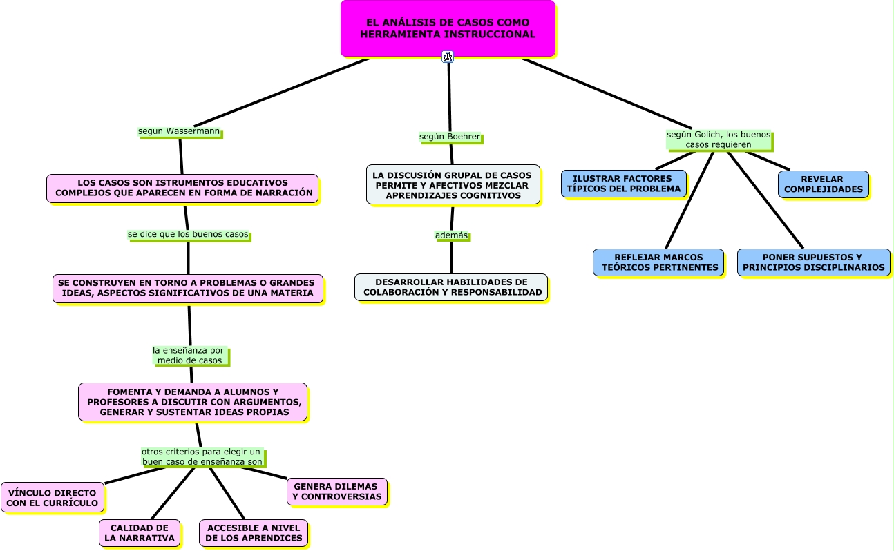 Este Cmap, tiene información relacionada con: CAP. 4 E ANÁLISIS DE CASOS, FOMENTA Y DEMANDA A ALUMNOS Y PROFESORES A DISCUTIR CON ARGUMENTOS, GENERAR Y SUSTENTAR IDEAS PROPIAS otros criterios para elegir un buen caso de enseñanza son ACCESIBLE A NIVEL DE LOS APRENDICES, EL ANÁLISIS DE CASOS COMO HERRAMIENTA INSTRUCCIONAL segun Wassermann LOS CASOS SON ISTRUMENTOS EDUCATIVOS COMPLEJOS QUE APARECEN EN FORMA DE NARRACIÓN, EL ANÁLISIS DE CASOS COMO HERRAMIENTA INSTRUCCIONAL según Golich, los buenos casos requieren PONER SUPUESTOS Y PRINCIPIOS DISCIPLINARIOS, LA DISCUSIÓN GRUPAL DE CASOS PERMITE Y AFECTIVOS MEZCLAR APRENDIZAJES COGNITIVOS además DESARROLLAR HABILIDADES DE COLABORACIÓN Y RESPONSABILIDAD, FOMENTA Y DEMANDA A ALUMNOS Y PROFESORES A DISCUTIR CON ARGUMENTOS, GENERAR Y SUSTENTAR IDEAS PROPIAS otros criterios para elegir un buen caso de enseñanza son CALIDAD DE LA NARRATIVA, EL ANÁLISIS DE CASOS COMO HERRAMIENTA INSTRUCCIONAL según Boehrer LA DISCUSIÓN GRUPAL DE CASOS PERMITE Y AFECTIVOS MEZCLAR APRENDIZAJES COGNITIVOS, SE CONSTRUYEN EN TORNO A PROBLEMAS O GRANDES IDEAS, ASPECTOS SIGNIFICATIVOS DE UNA MATERIA la enseñanza por medio de casos FOMENTA Y DEMANDA A ALUMNOS Y PROFESORES A DISCUTIR CON ARGUMENTOS, GENERAR Y SUSTENTAR IDEAS PROPIAS, EL ANÁLISIS DE CASOS COMO HERRAMIENTA INSTRUCCIONAL según Golich, los buenos casos requieren ILUSTRAR FACTORES TÍPICOS DEL PROBLEMA, EL ANÁLISIS DE CASOS COMO HERRAMIENTA INSTRUCCIONAL según Golich, los buenos casos requieren REVELAR COMPLEJIDADES, FOMENTA Y DEMANDA A ALUMNOS Y PROFESORES A DISCUTIR CON ARGUMENTOS, GENERAR Y SUSTENTAR IDEAS PROPIAS otros criterios para elegir un buen caso de enseñanza son GENERA DILEMAS Y CONTROVERSIAS, EL ANÁLISIS DE CASOS COMO HERRAMIENTA INSTRUCCIONAL según Golich, los buenos casos requieren REFLEJAR MARCOS TEÓRICOS PERTINENTES, LOS CASOS SON ISTRUMENTOS EDUCATIVOS COMPLEJOS QUE APARECEN EN FORMA DE NARRACIÓN se dice que los buenos casos SE CONSTRUYEN EN TORNO A PROBLEMAS O GRANDES IDEAS, ASPECTOS SIGNIFICATIVOS DE UNA MATERIA, FOMENTA Y DEMANDA A ALUMNOS Y PROFESORES A DISCUTIR CON ARGUMENTOS, GENERAR Y SUSTENTAR IDEAS PROPIAS otros criterios para elegir un buen caso de enseñanza son VÍNCULO DIRECTO CON EL CURRÍCULO