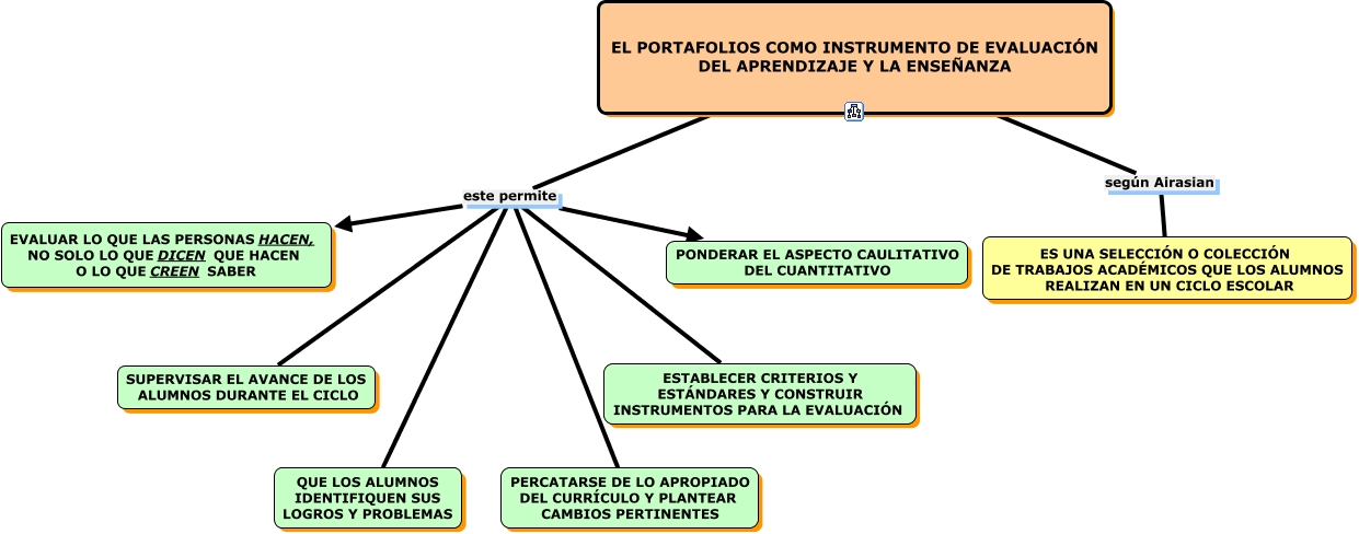 Este Cmap, tiene información relacionada con: CAP. 5 D, EL PORTAFOLIOS COMO INSTRUMENTO DE EVALUACIÓN DEL APRENDIZAJE Y LA ENSEÑANZA este permite PONDERAR EL ASPECTO CAULITATIVO DEL CUANTITATIVO, EL PORTAFOLIOS COMO INSTRUMENTO DE EVALUACIÓN DEL APRENDIZAJE Y LA ENSEÑANZA según Airasian ES UNA SELECCIÓN O COLECCIÓN DE TRABAJOS ACADÉMICOS QUE LOS ALUMNOS REALIZAN EN UN CICLO ESCOLAR, EL PORTAFOLIOS COMO INSTRUMENTO DE EVALUACIÓN DEL APRENDIZAJE Y LA ENSEÑANZA este permite EVALUAR LO QUE LAS PERSONAS HACEN, NO SOLO LO QUE DICEN QUE HACEN O LO QUE CREEN SABER, EL PORTAFOLIOS COMO INSTRUMENTO DE EVALUACIÓN DEL APRENDIZAJE Y LA ENSEÑANZA este permite PERCATARSE DE LO APROPIADO DEL CURRÍCULO Y PLANTEAR CAMBIOS PERTINENTES, EL PORTAFOLIOS COMO INSTRUMENTO DE EVALUACIÓN DEL APRENDIZAJE Y LA ENSEÑANZA este permite QUE LOS ALUMNOS IDENTIFIQUEN SUS LOGROS Y PROBLEMAS, EL PORTAFOLIOS COMO INSTRUMENTO DE EVALUACIÓN DEL APRENDIZAJE Y LA ENSEÑANZA este permite ESTABLECER CRITERIOS Y ESTÁNDARES Y CONSTRUIR INSTRUMENTOS PARA LA EVALUACIÓN, EL PORTAFOLIOS COMO INSTRUMENTO DE EVALUACIÓN DEL APRENDIZAJE Y LA ENSEÑANZA este permite SUPERVISAR EL AVANCE DE LOS ALUMNOS DURANTE EL CICLO