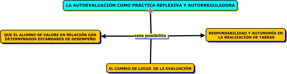 Este Cmap, tiene información relacionada con: CAP. 5 G, LA AUTOEVALUACIÓN COMO PRÁCTICA REFLEXIVA Y AUTORREGULADORA esta posibilita RESPONSABILIDAD Y AUTONOMÍA EN LA REALIZACIÓN DE TAREAS, LA AUTOEVALUACIÓN COMO PRÁCTICA REFLEXIVA Y AUTORREGULADORA esta posibilita EL CAMBIO DE LOCUS DE LA EVALUACIÓN, LA AUTOEVALUACIÓN COMO PRÁCTICA REFLEXIVA Y AUTORREGULADORA esta posibilita QUE EL ALUMNO SE VALORE EN RELACIÓN CON DETERMINADOS ESTÁNDARES DE DESEMPEÑO